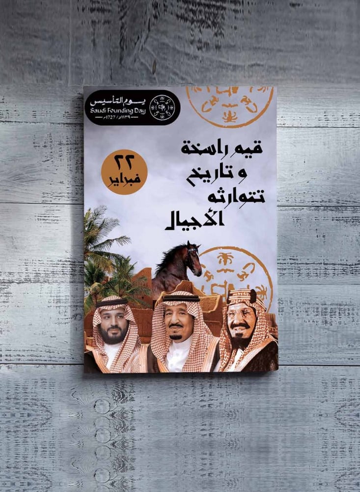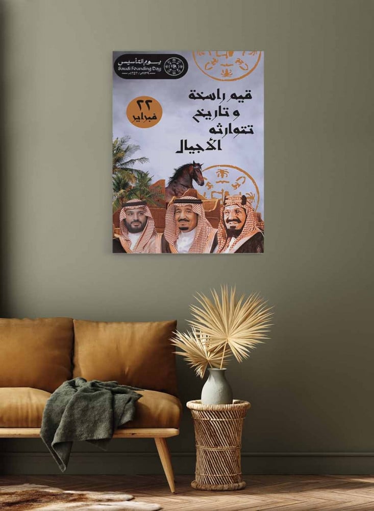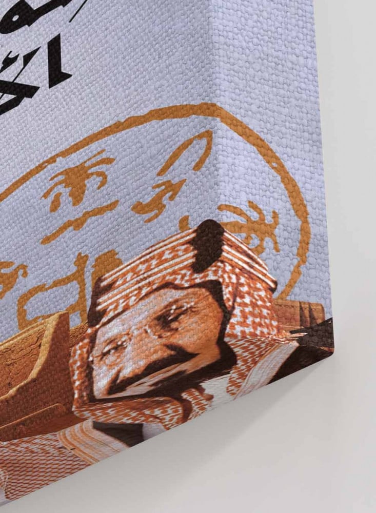 Foundation Day Canvas is a painting made of strong canvas and fixed on a wooden frame. This painting talks about the most important national occasion for the Saudi people, which is the day of the founding of the Kingdom of Saudi Arabia when it was founded by Imam Muhammad bin Saud three centuries ago, and this painting reminds us of the stability, security and development in which you live Kingdom today thanks to its unification in 1139 AH .