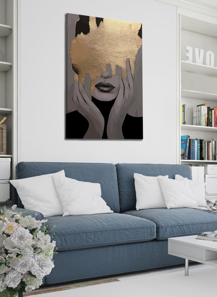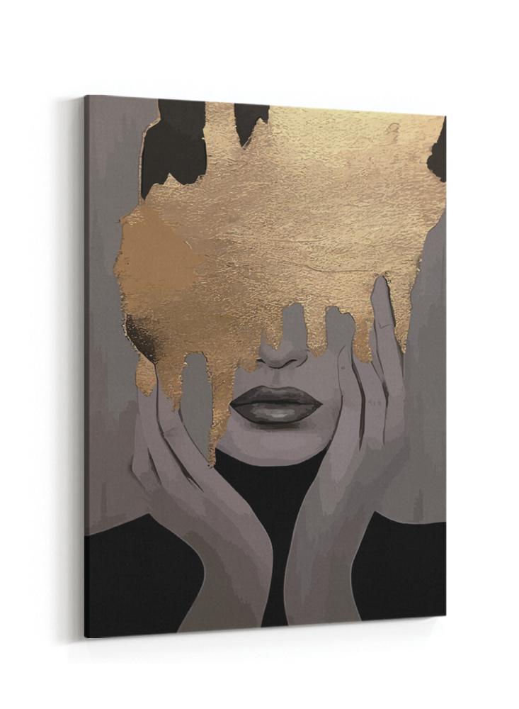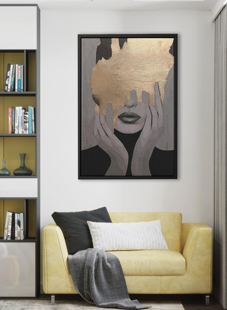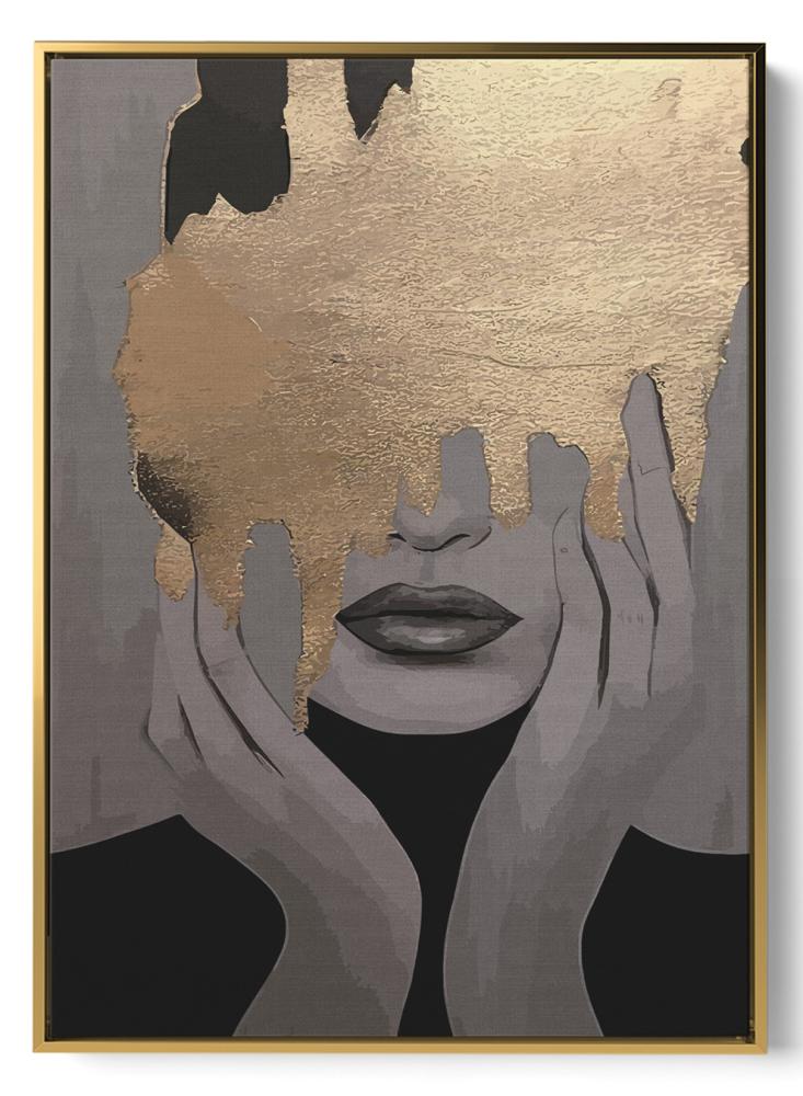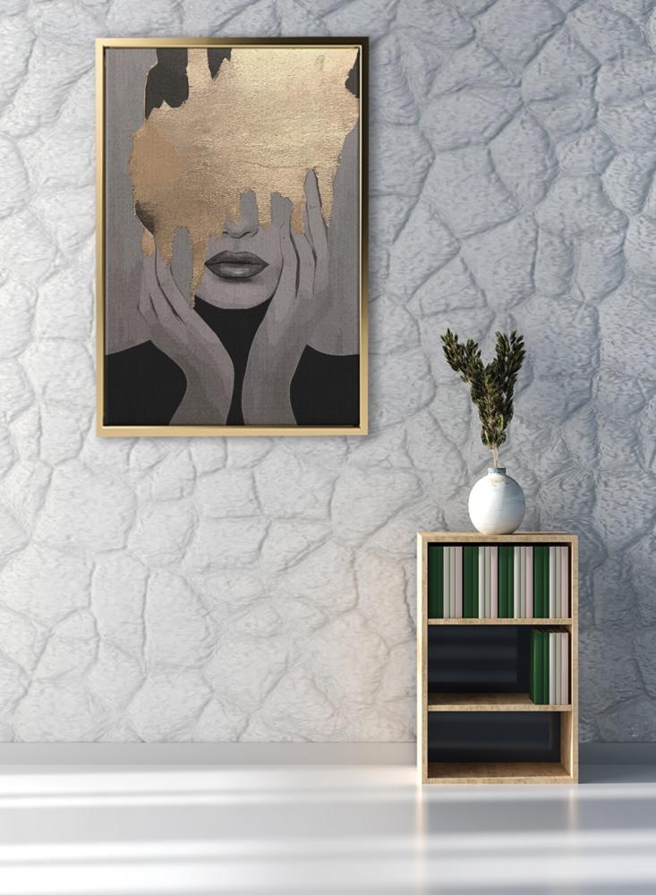 التي تصور نصف وجه مرآة تضع برقة يدها على وجها، في مزيج مذهل من الألوان الهادئة والدرجات الأنيقة من الذهبي والأسود. هذه اللوحة تعكس جمال اللمسات الفنية الدقيقة التي تجسد لحظة تأملية وشخصية قوية، حيث تتداخل الألوان الراقية بسلاسة لتخلق تبايناً جذاباً ومظهراً عصريًا يتناغم مع أي ديكور.