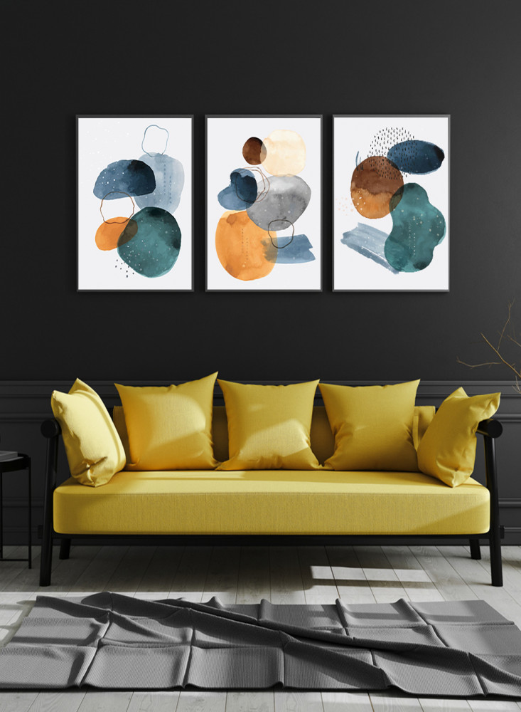 طقم من ٣ لوحات كانفاس على إطار خشبي، تصميم دوائر مرسومة يدويا، للمنزل، غرفة المعيشة، المكتب، الديكور