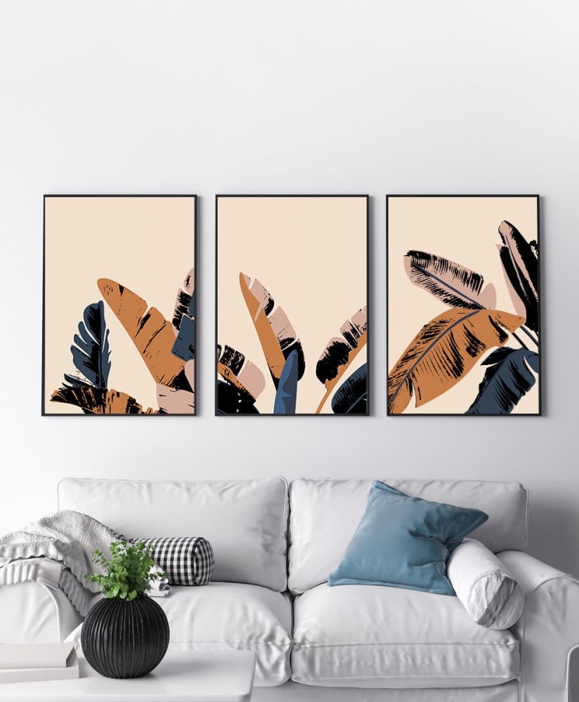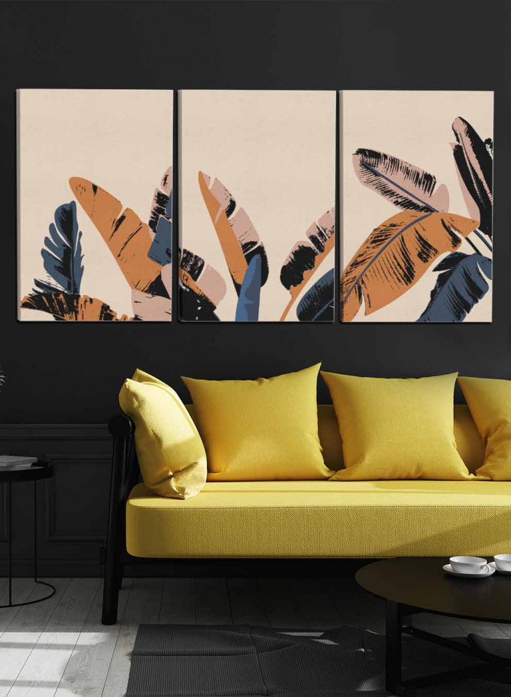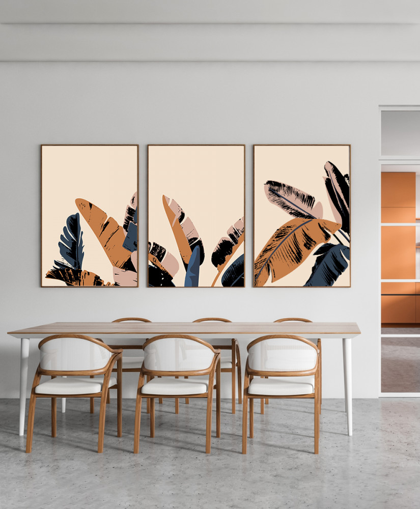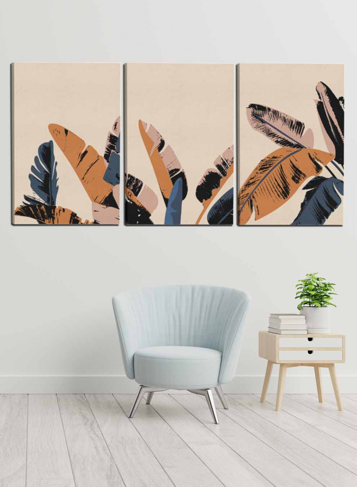 طقم من ٣ لوحات كانفاس على إطار خشبي، تصميم أوراق أشجار استوائية، للمنزل، غرفة المعيشة، المكتب، الديكور