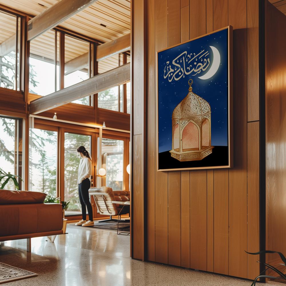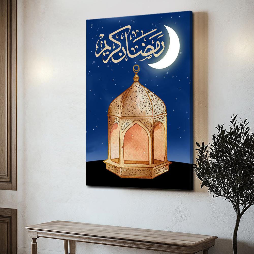 الحصول على لوحات رمضانية هي فكرة رائعة لتزيين المنزل مع اقتراب شهر رمضان المبارك، لأن هذه اللوحات تزيد من الشعور بأجواء رمضان وتعبر عن الفرحة والاحتفال بقدومه. إنها تتوفر في أشكال مختلفة لتناسب جميع الأذواق والاحتياجات، نرشح لك من متجر لوحة هذه اللوحة الرمضانية الجميلة بتصميم رمضان كريم مع فانوس رمضان والهلال المضيء والنجوم من حوله. هذه اللوحة قادرة على تزيين أي مكان توضع به في المنزل.