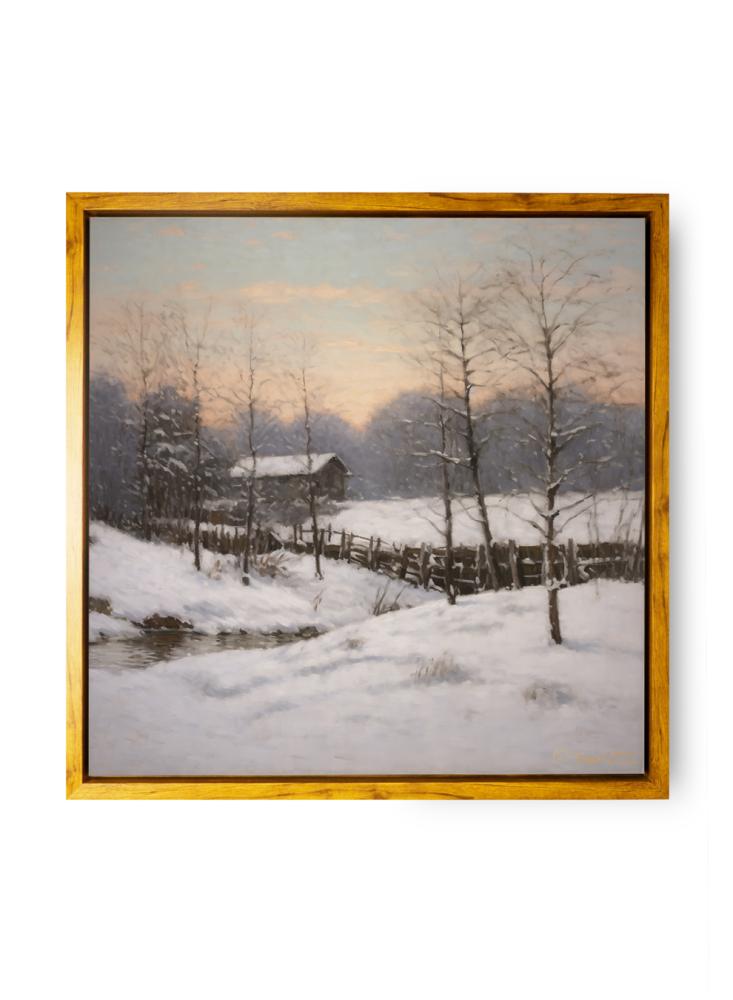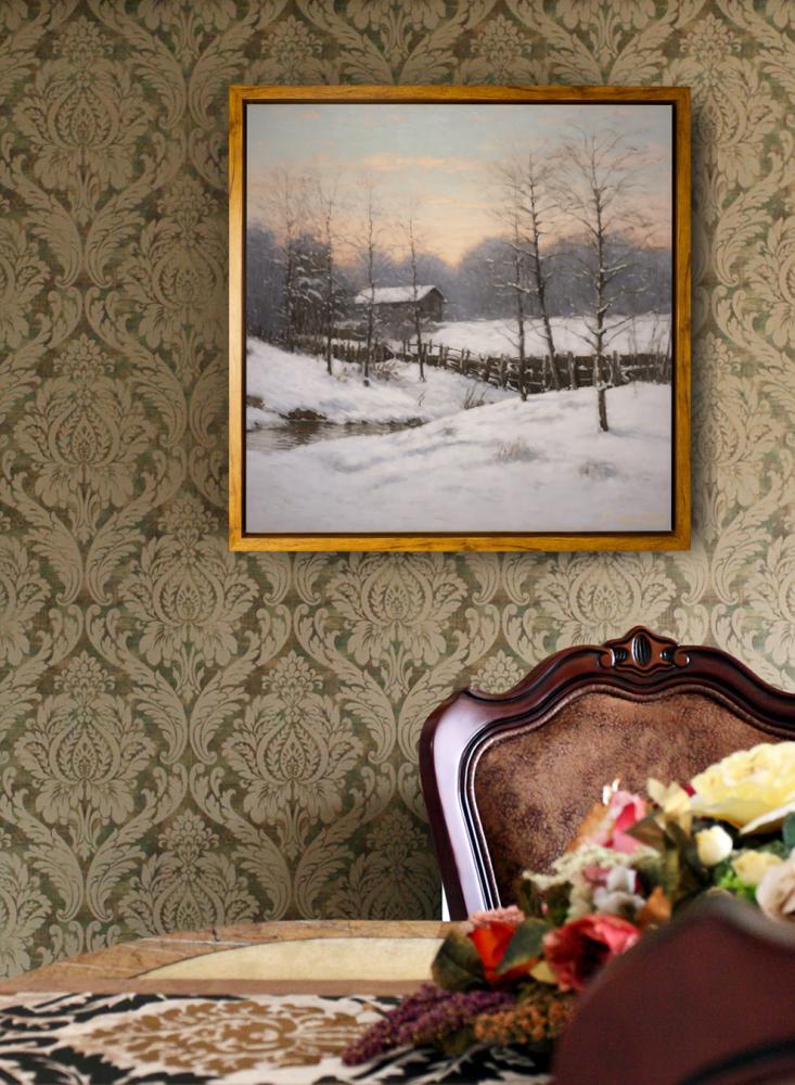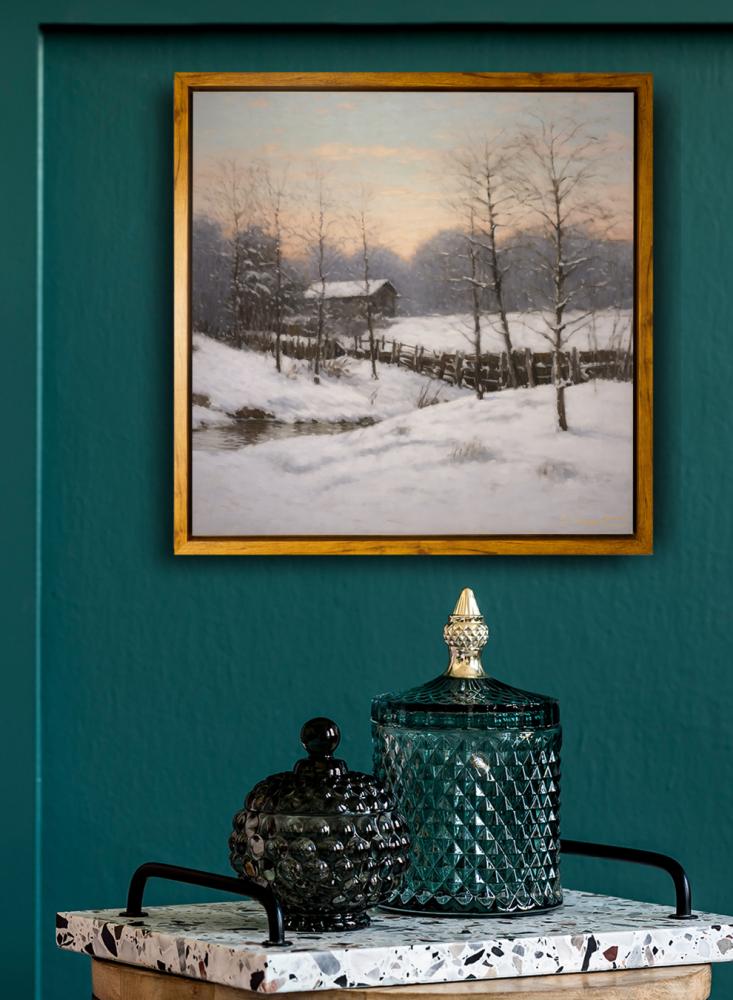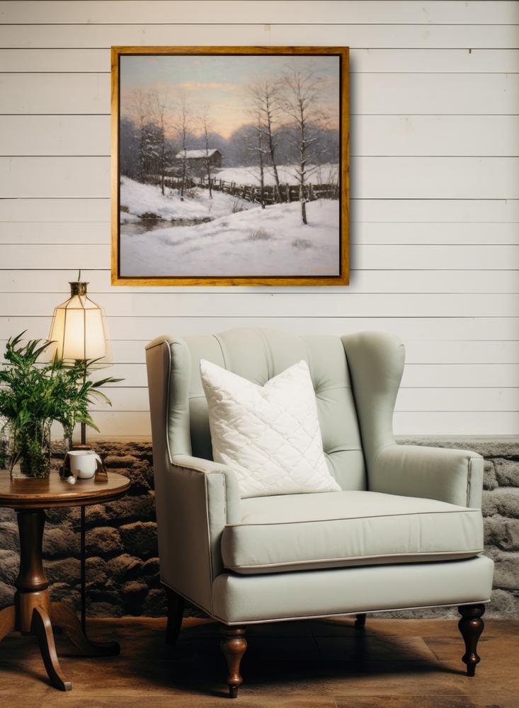 لوحة كانفاس على إطار خشبي بإطار خارجي باللون الخشبي وتصميم بيت كلاسيكي محاط بالأشجار والثلوج