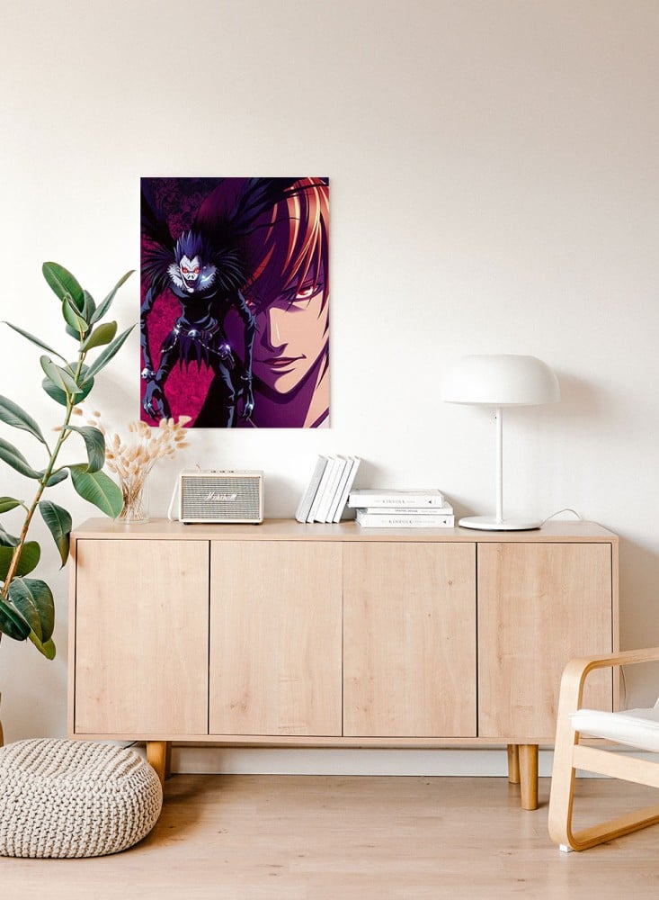 لوحة بوستر انمي مذكرة الموت بتصميم مميز لشخصيات لايت وريوك من أفضل الخامات المقاومة للتلف. يتميز بتوفير أحجام مختلفة يمكن تعليقه على الحائط بغرفة الأطفال أو غرفة المعيشة، مناسب لجميع الأماكن.