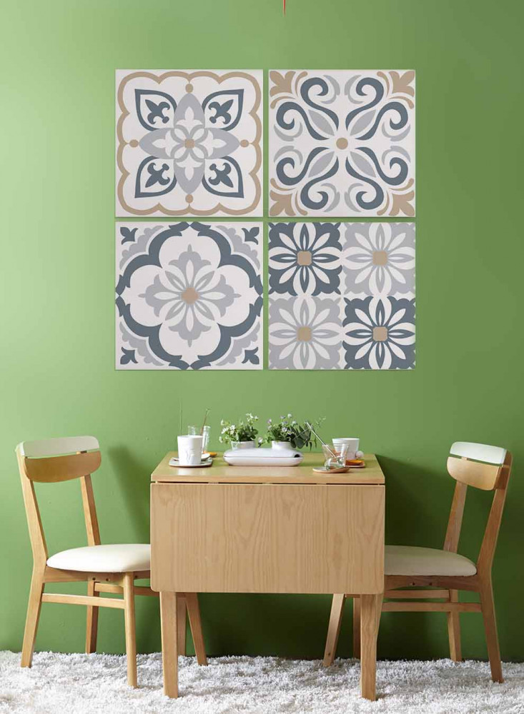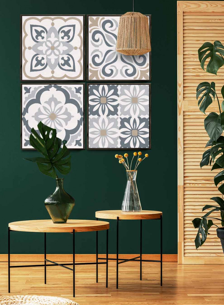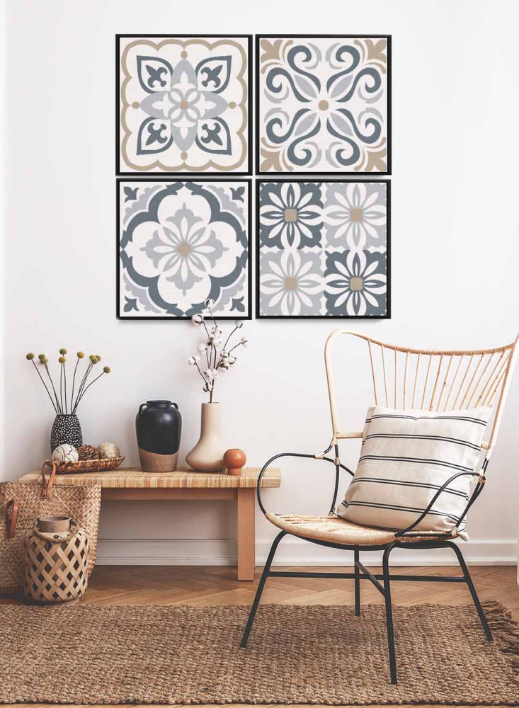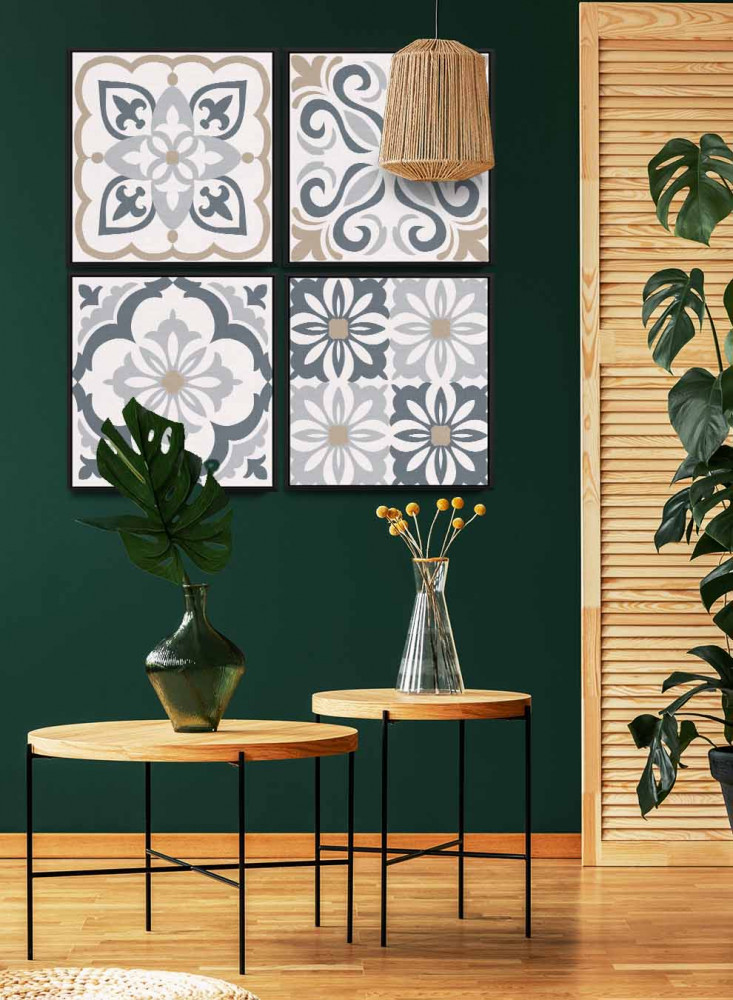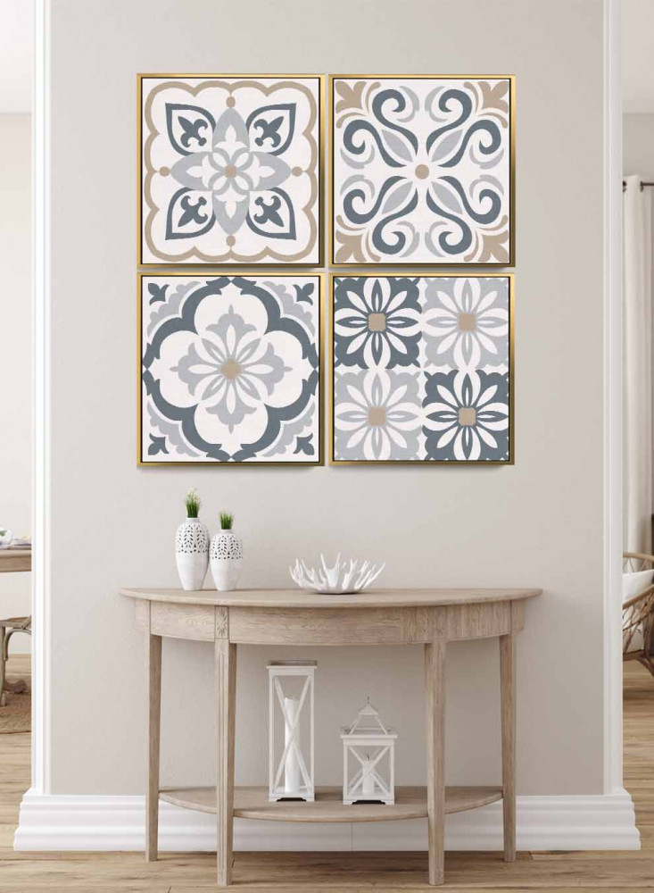 طقم من ٤ لوحات كانفاس مربع على إطار خشبي، تصميم نمط سيراميك ملون، للمنزل، غرفة المعيشة، المكتب، الديكور