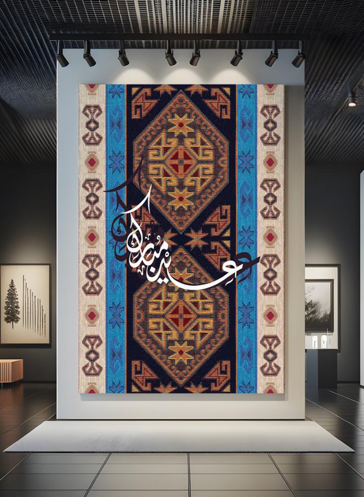 • التصميم والأبعاد: مستوحى من الأنماط الشرقية التقليدية مع جملة "عيد مبارك". متاحة بأحجام متنوعة: 40x30، 50x70، 60x90، 70x100، 80x110 سم.