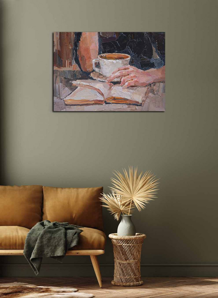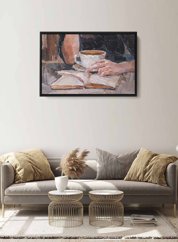 لوحة كانفاس على إطار خشبي، تصميم يقرأ كتاب ويشرب القهوة ، للمنزل، غرفة المعيشة، المكتب، الديكور