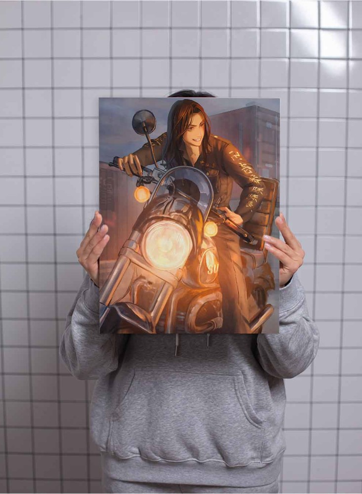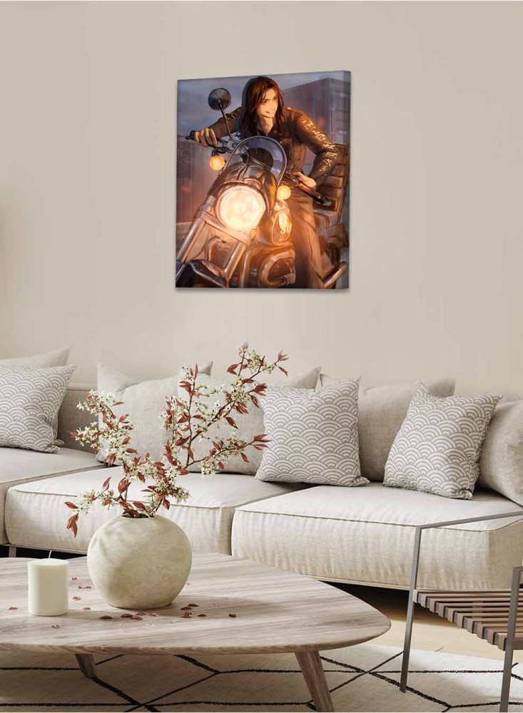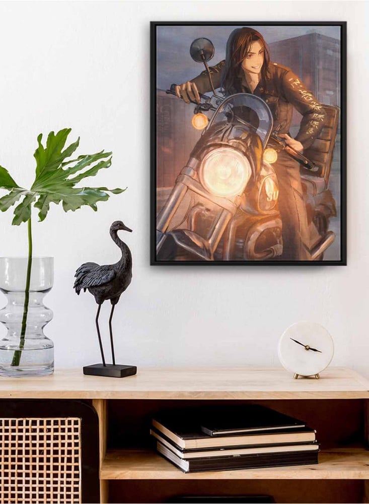 - توضح لوحة كانفاس بتصميم باجى شخصية باجي الشاب الجرئ الذي يركب الدراجة النارية الخاصة بها ويتجول بها.