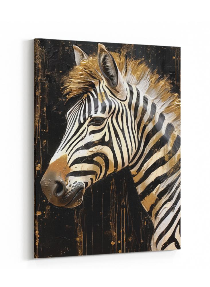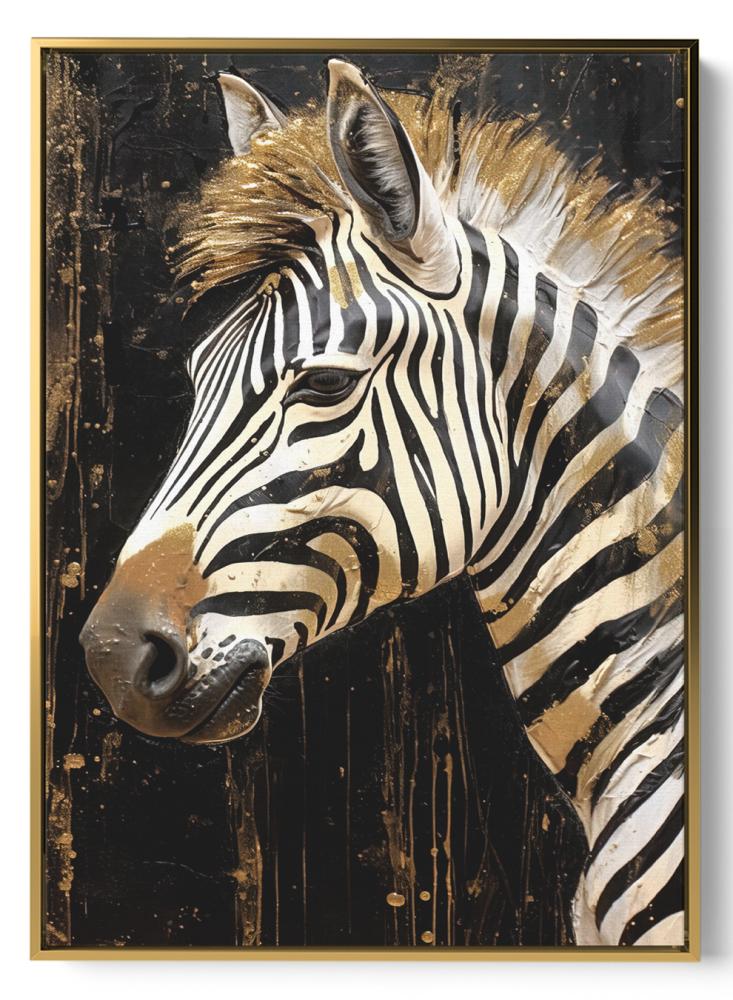 - تباين جذاب: يمزج التصميم بين الخطوط التقليدية للحمار الوحشي والتفاصيل الذهبية اللامعة، مما يخلق تبايناً فريداً يضفي عمقاً وإشراقاً على العمل الفني.