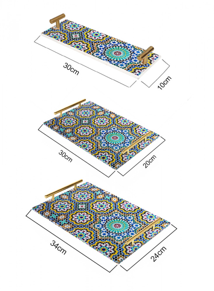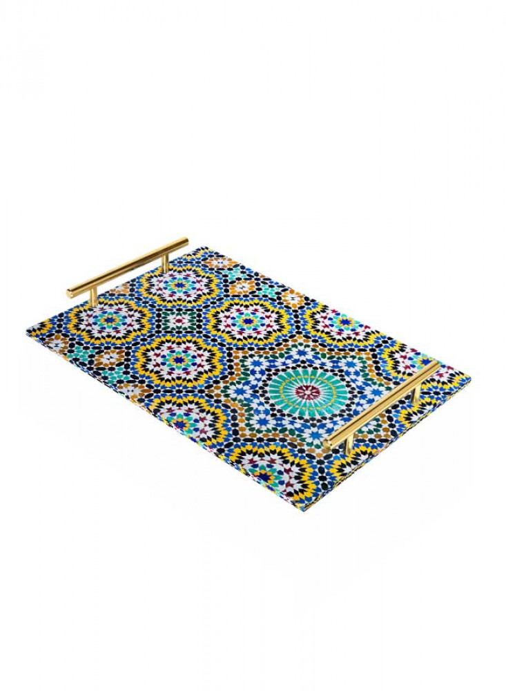 صينية تقديم مصنوعة من الأكريليك بمقابض معدنية ذهبية اللون مزخرفة بتصميم فسيفساء