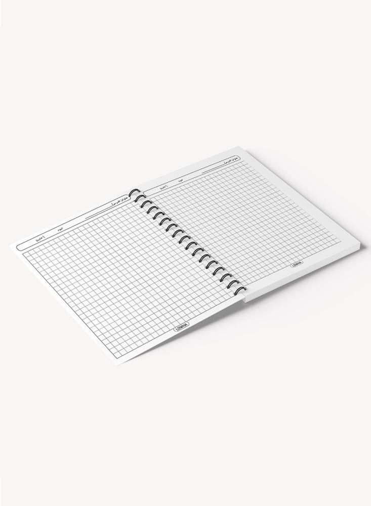 يحتوي الدفتر على ٦٠ ورقة بغلاف من الورق المقوى مطبوع على الجهتين مجمعين بسلك حلزوني يحافظ على الصفحات سليمة ويمكّنك من قلب الصفحات بسهولة.