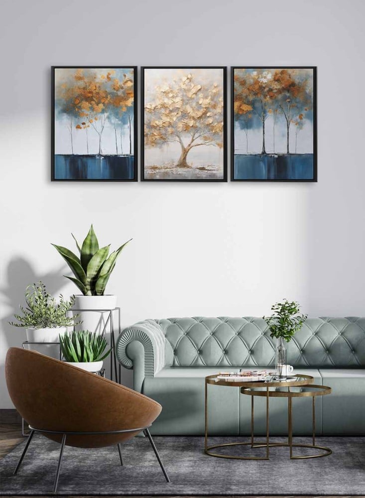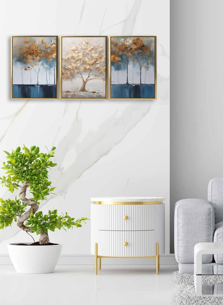 طقم من ٣ لوحات كانفاس على إطار خشبي بتصميم فن تجريدي أشجار ذهبية