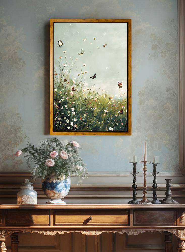 لوحة كانفاس على إطار خشبي بإطار خارجي باللون الخشبي وتصميم كلاسيكي لفراشات تحلق وسط الزهور