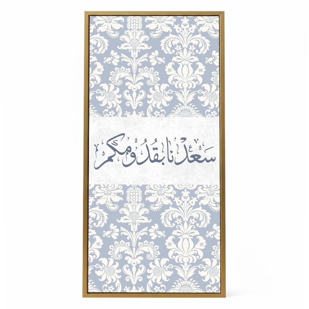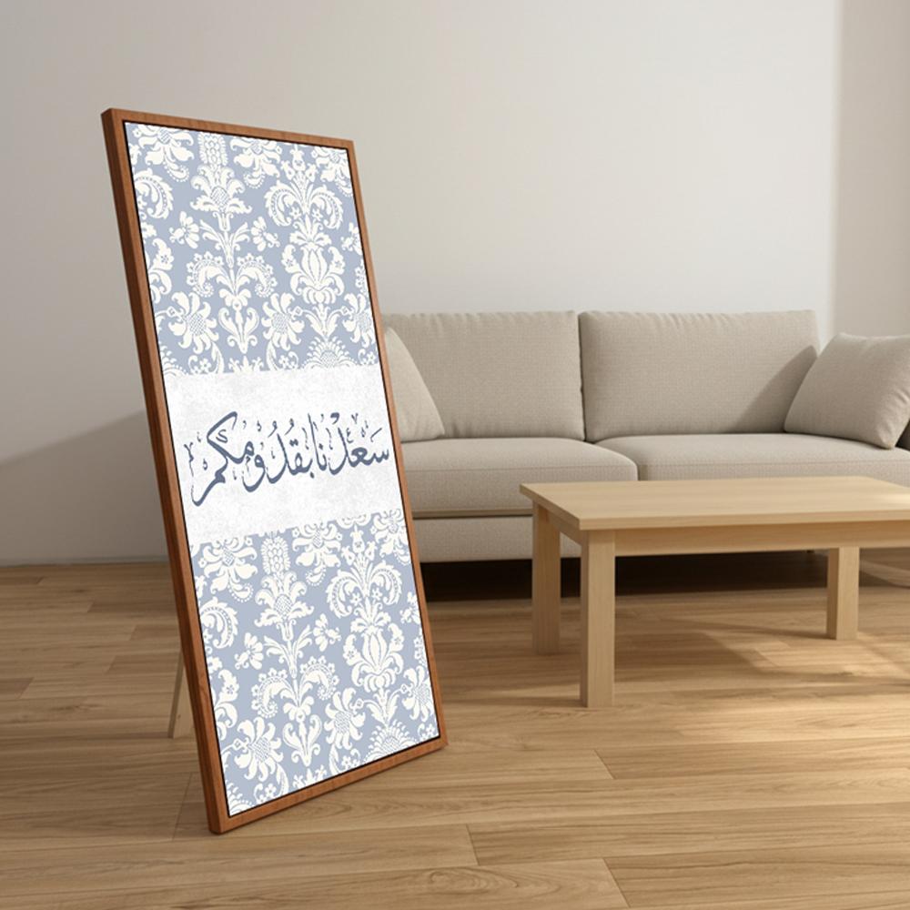 مواصفات لوحة استقبال كانفاس على إطار خشبي مع حامل خلفي بتصميم سعدنا بقدومكم