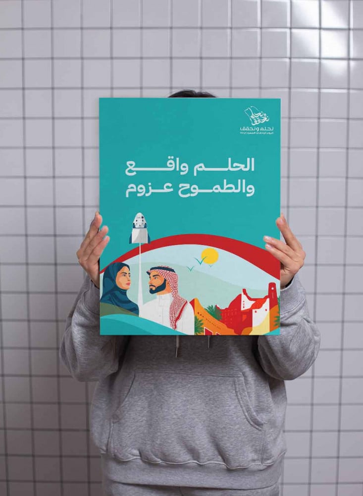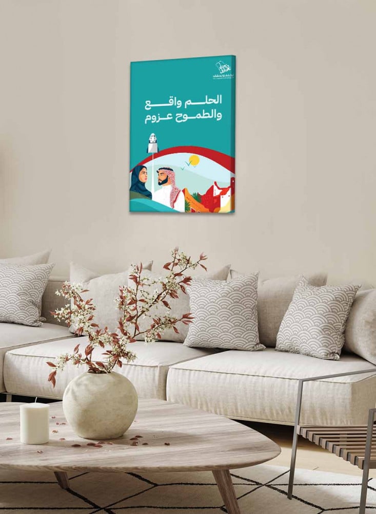 - لوحة كانفاس على إطار خشبي لليوم الوطني بتصميم الحلم واقع والطموح عزوم.