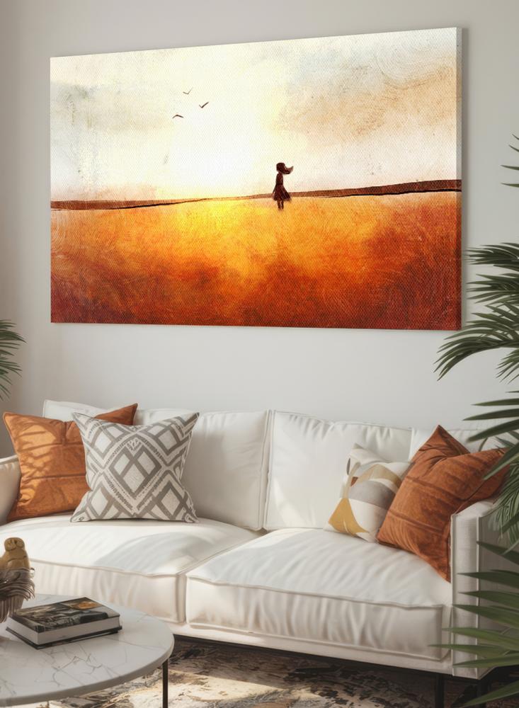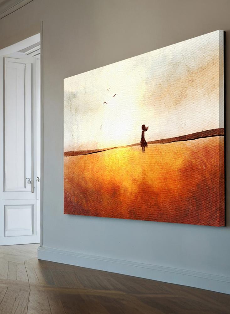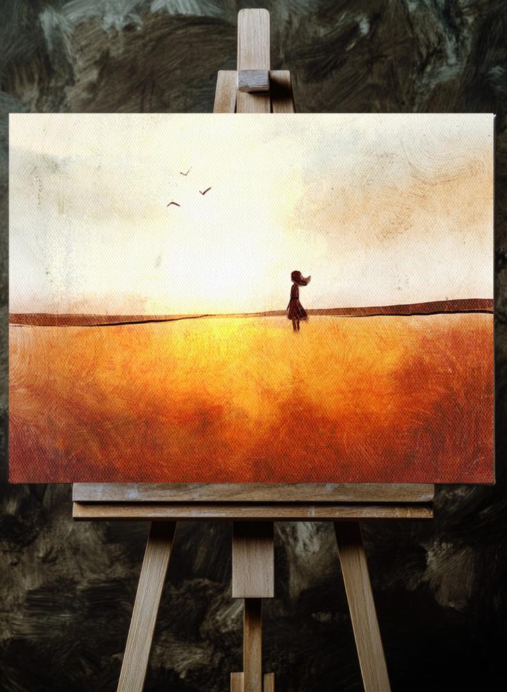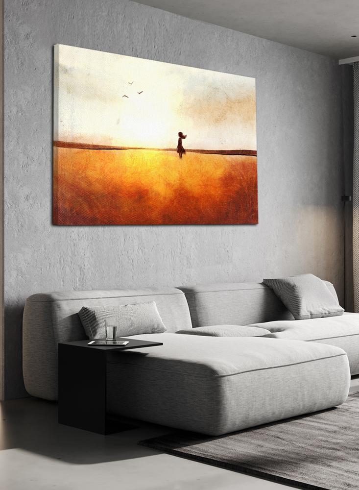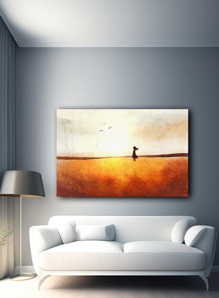 لوحة كانفاس على إطار خشبي بتصميم فن تجريدي لفتاة في حقل تحلق فوقه الطيور