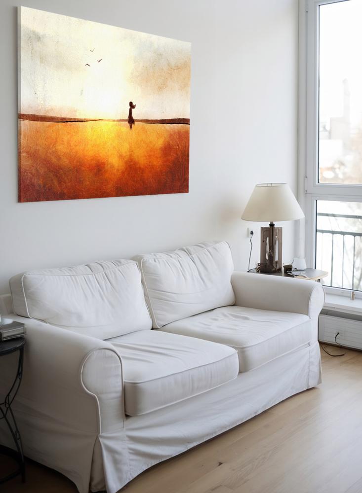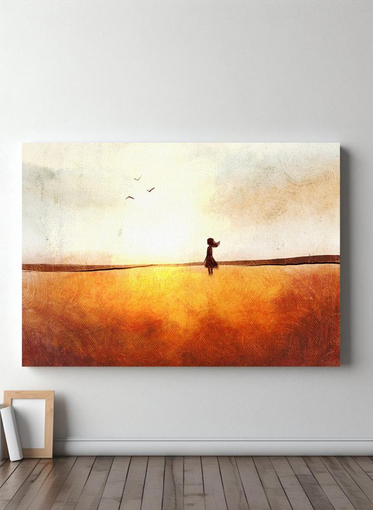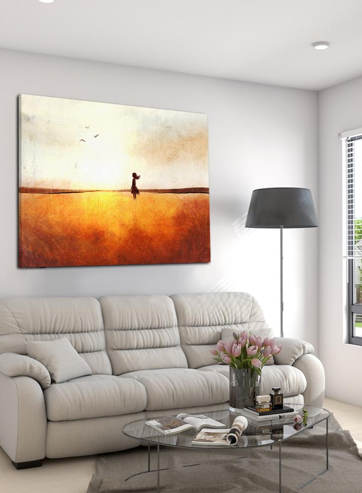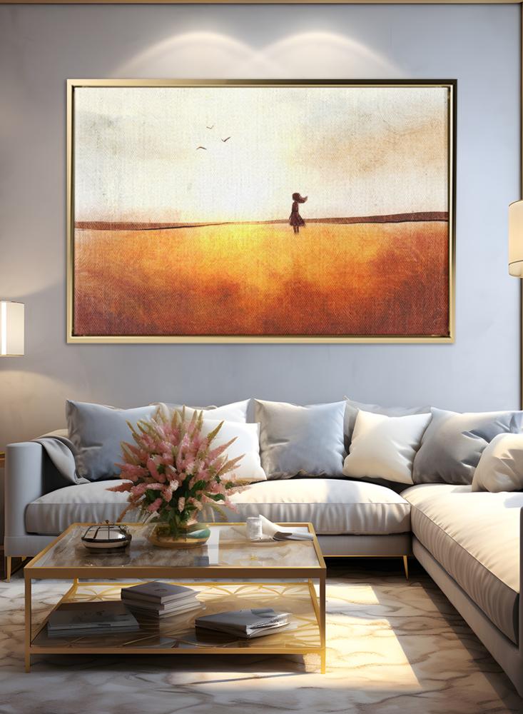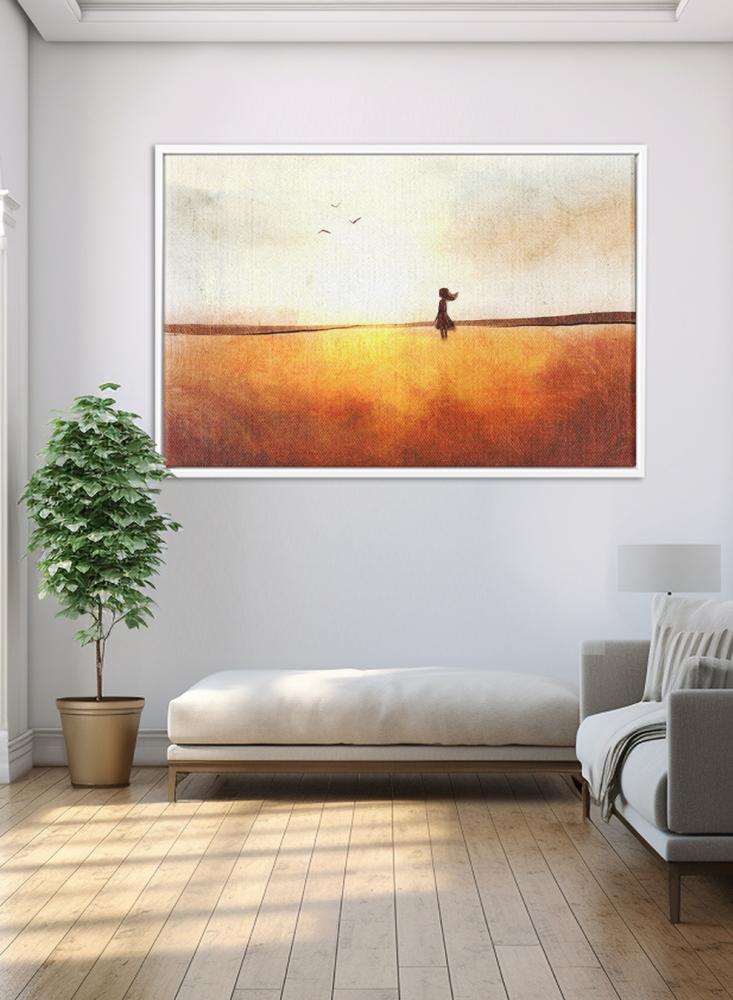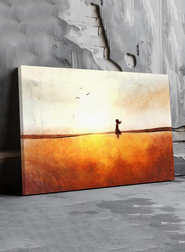 لوحة كانفاس على إطار خشبي بتصميم فن تجريدي لفتاة في حقل تحلق فوقه الطيور