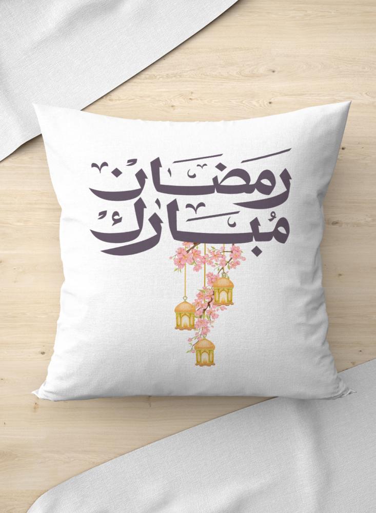 • يتميز غلاف الوسادة هذا بجمال وبساطة تصميمه حيث كلمة رمضان مبارك مكتوبة بخط جميل وواضح والفوانيس والورود الجميلة تظهر أسفلها.