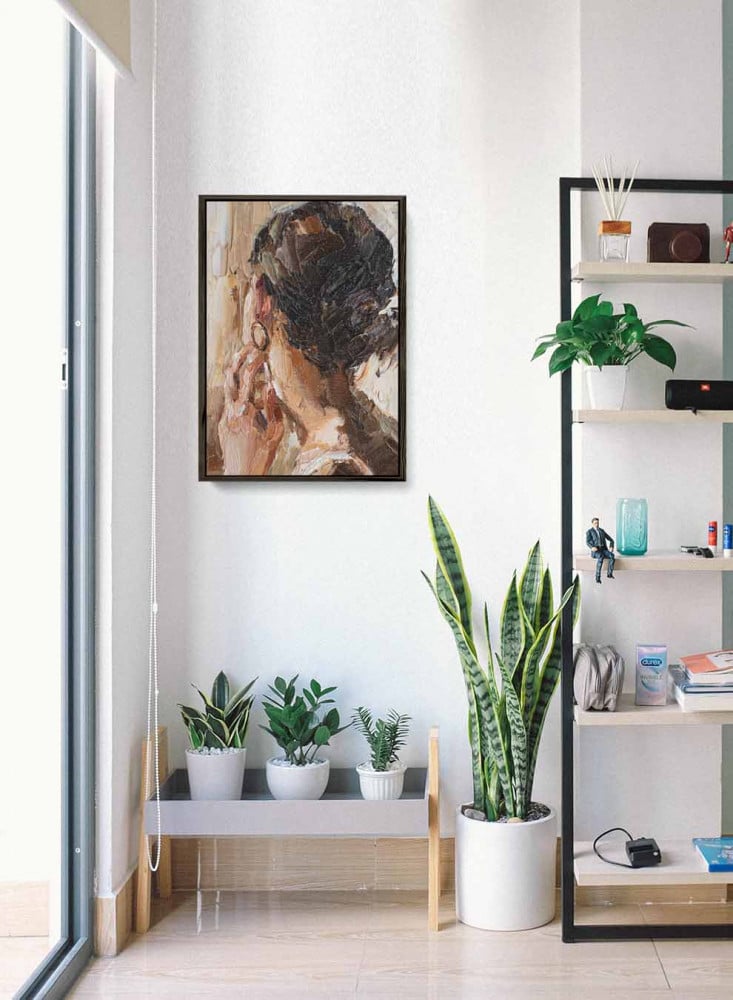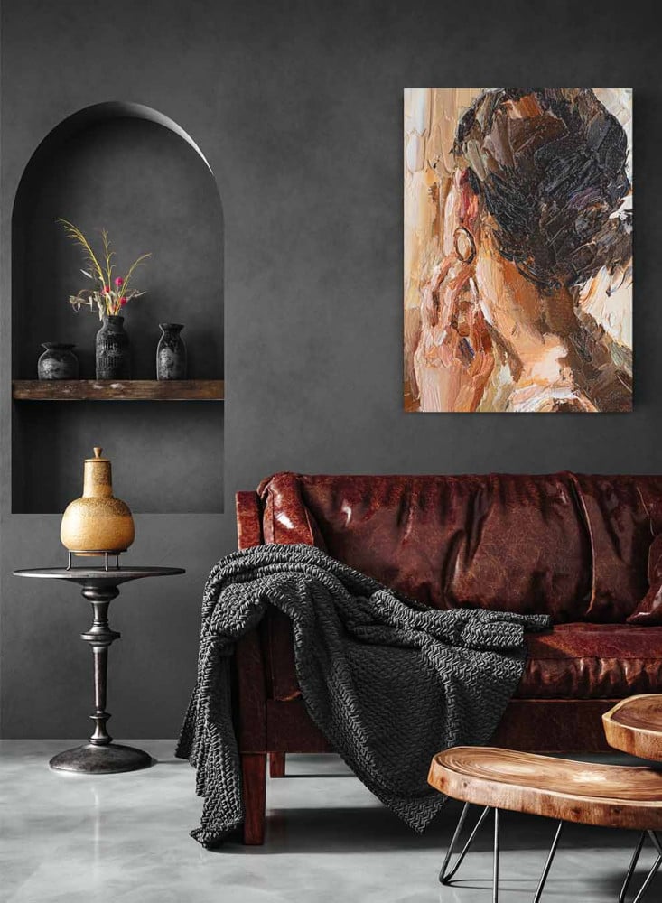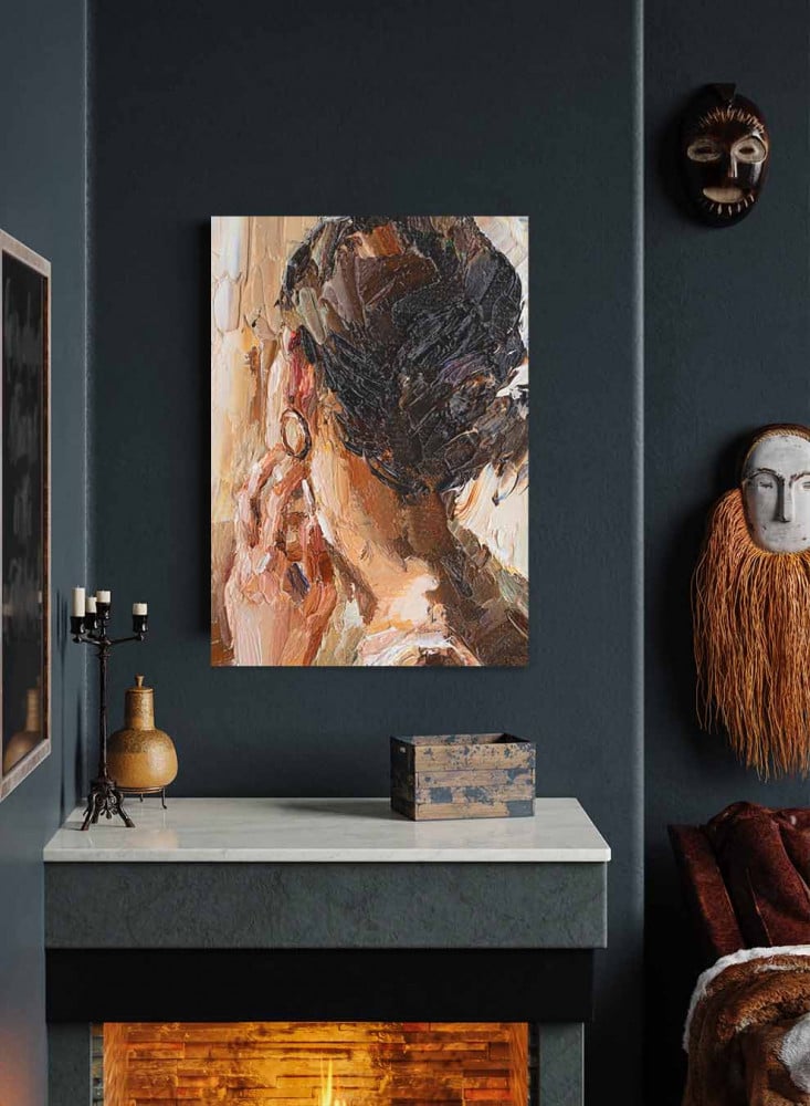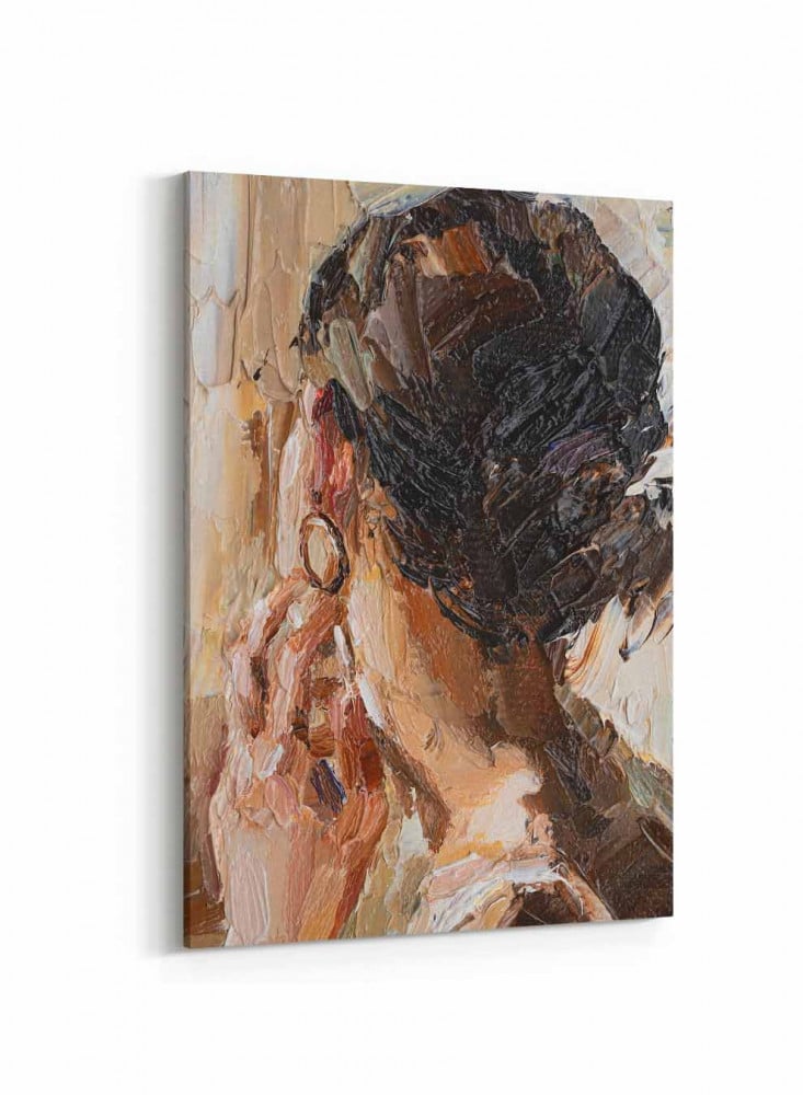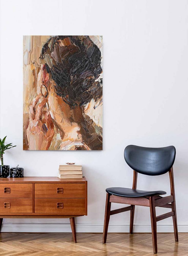 لوحة كانفاس على إطار خشبي، تصميم فن زيتي لامرأة ترتدي حلق، للمنزل، غرفة المعيشة، المكتب، الديكور