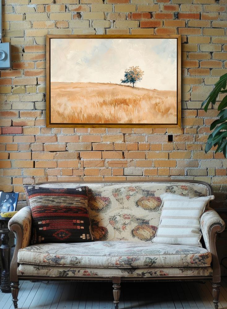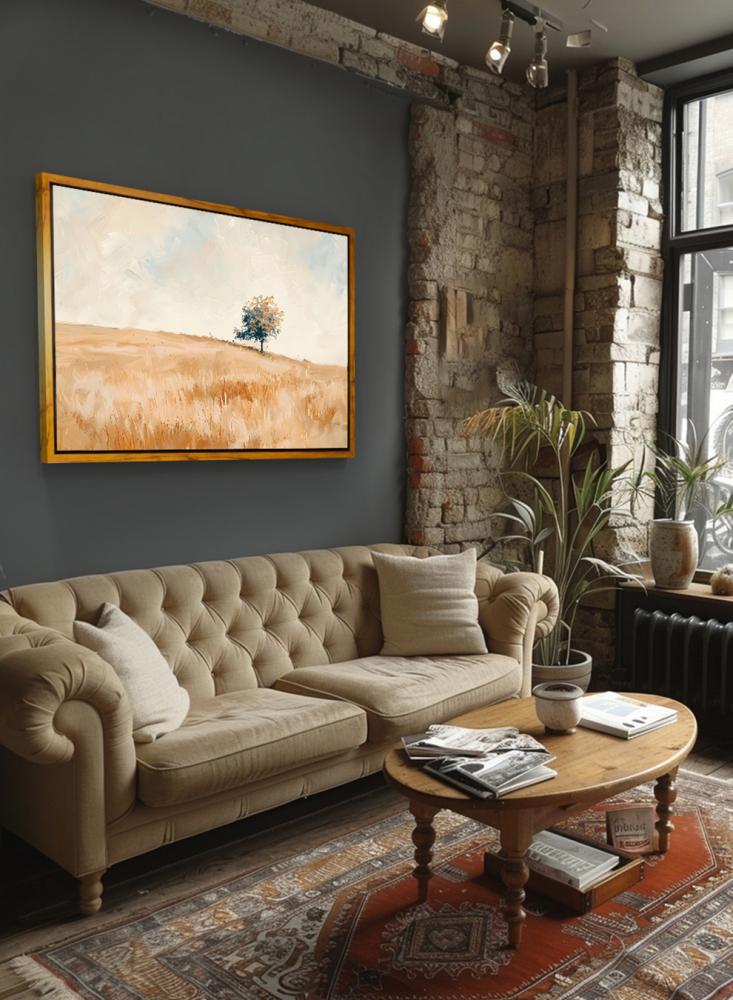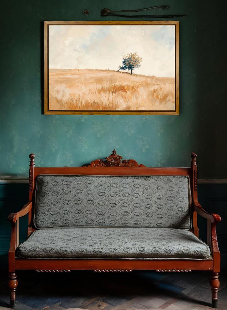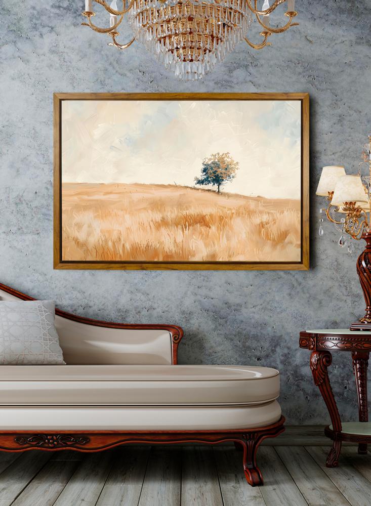 لوحة كانفاس على إطار خشبي بإطار خارجي باللون الخشبي وتصميم منظر كلاسيكي لحقل هادئ