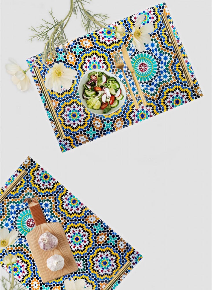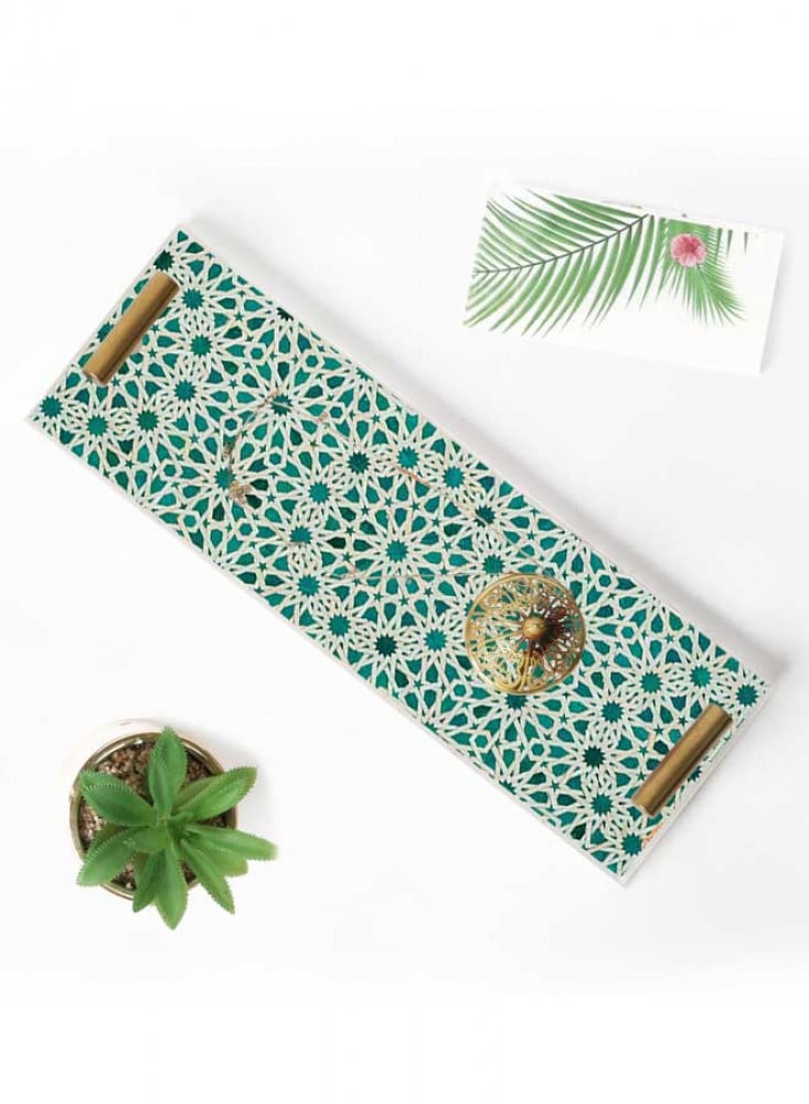 - صينية تقديم مصنوعة من الأكريليك بمقابض معدنية ذهبية اللون مزخرفة بتصميم البلاط المغربي