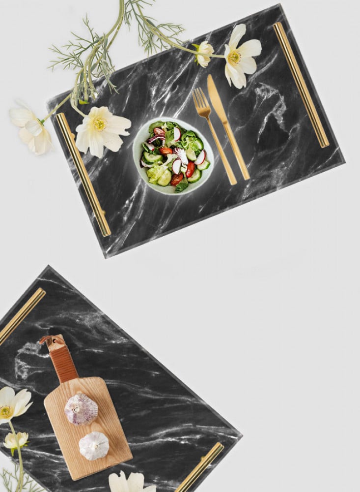مقابض معدنية: هذه الصينية مصنوعة من مقابض معدنية مقاومة للصدأ بلون ذهبي. شكل عصري بتصميم جميل يعطي تجربة بصرية مريحة.