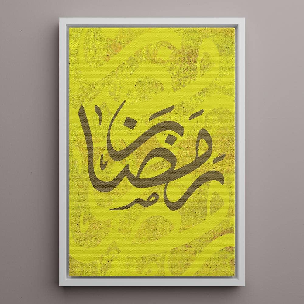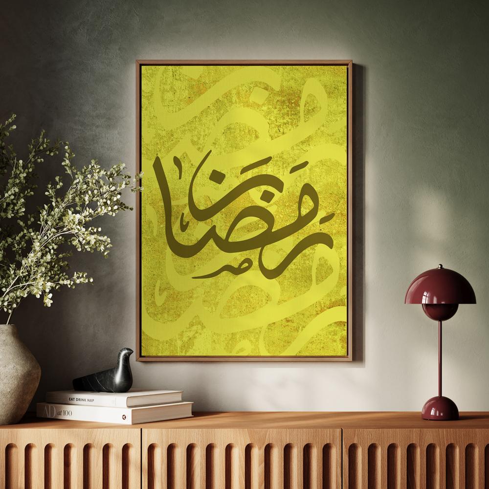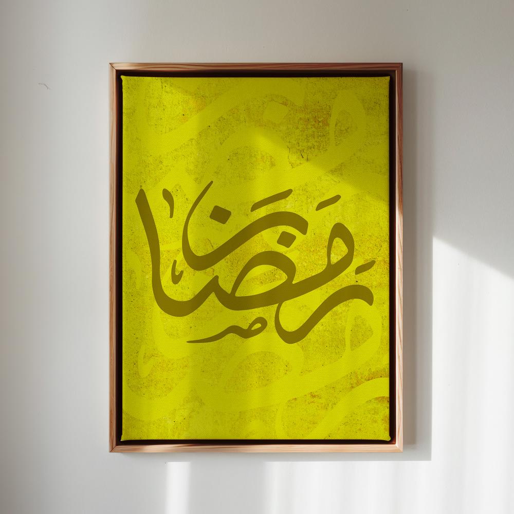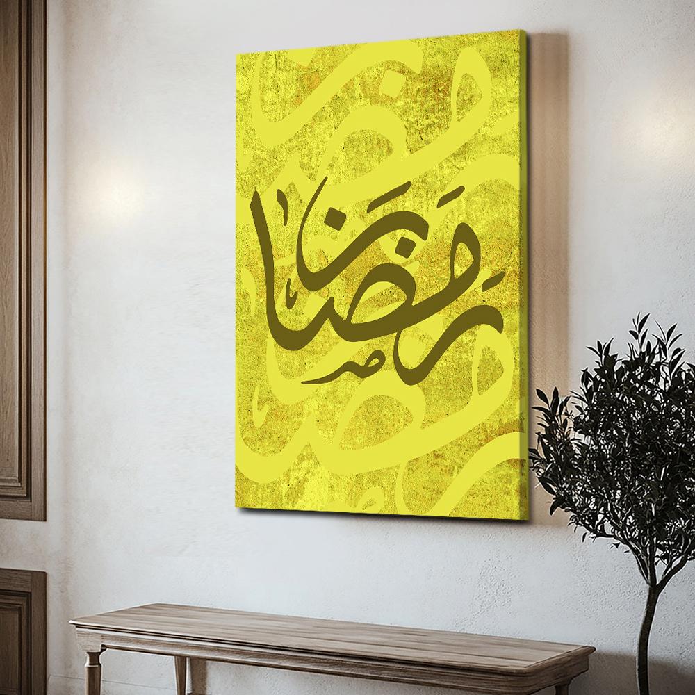 لوحة كانفاس على إطار خشبي بتصميم رمضان بخط مميز على خلفية صفراء