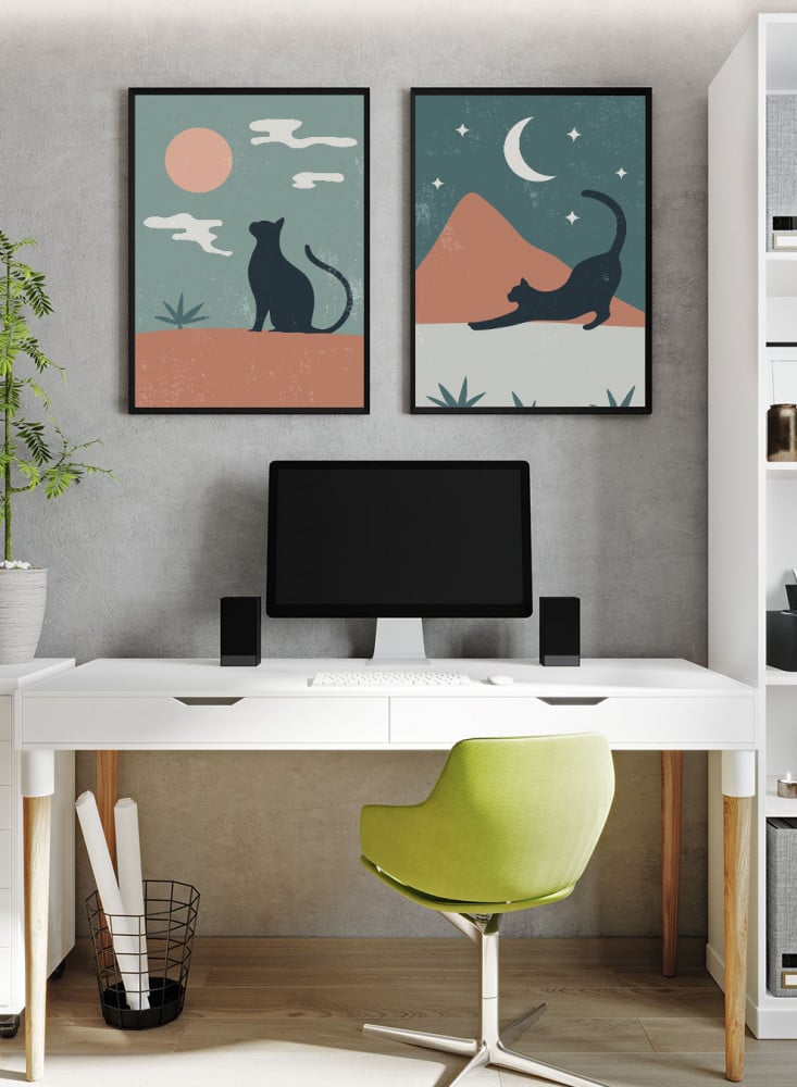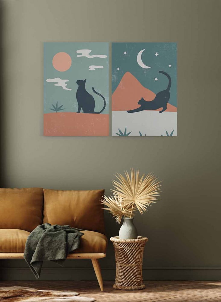 طقم من لوحتين كانفاس على إطار خشبي، تصميم فن تجريدي قطة وقمر ونحوم وسحاب وجبال، للمنزل، غرفة المعيشة، المكتب، الديكور