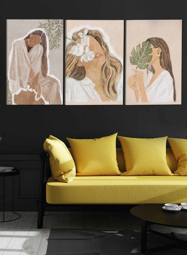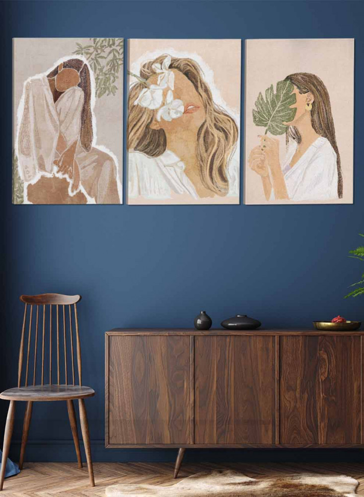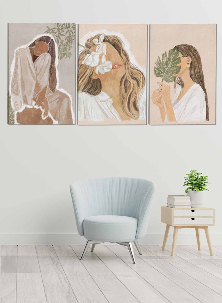 طقم من ٣ لوحات كانفاس على إطار خشبي، تصميم فتاة جميلة، للمنزل، غرفة المعيشة، المكتب، الديكور