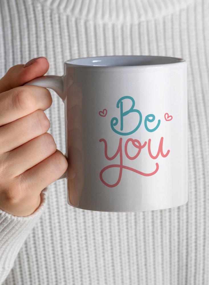 • كوب سيراميك كن أنت محلي يحمل هوية براند سعودي مسجل، ما يعكس الأصالة والموثوقية في كل قطعة.