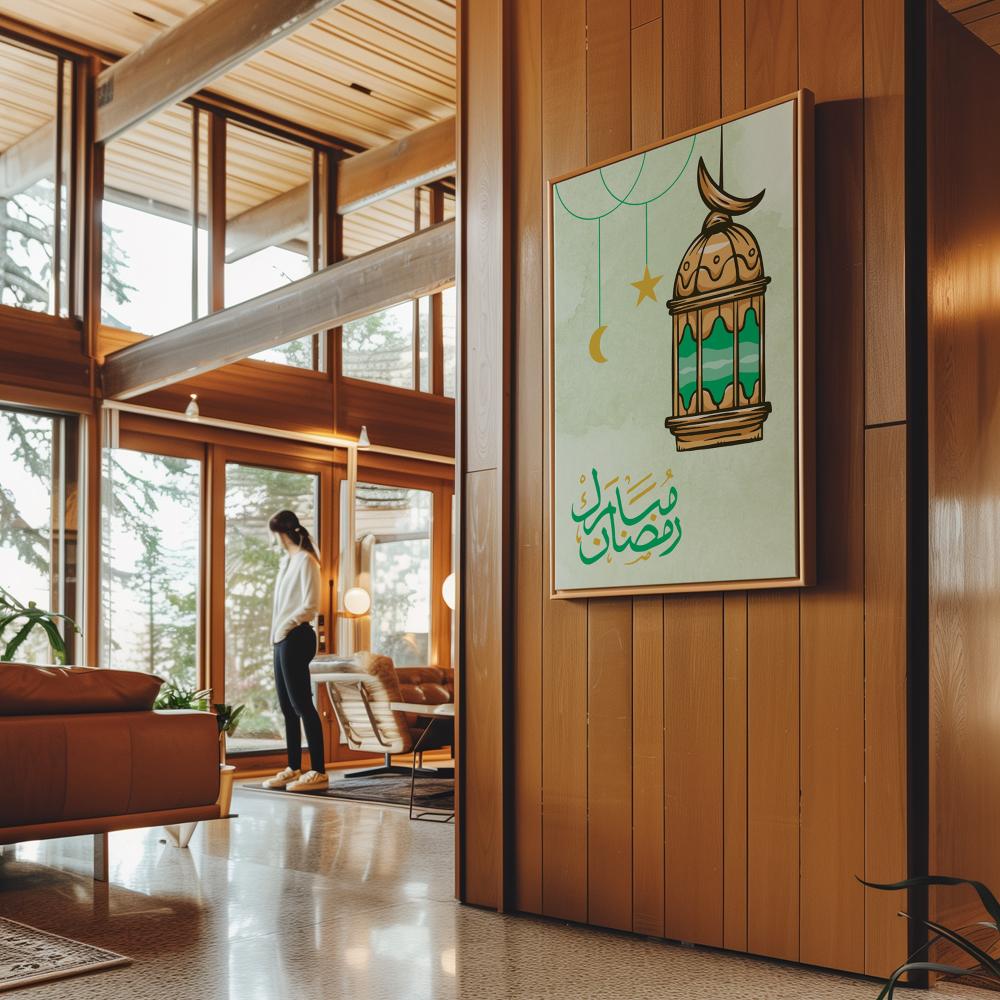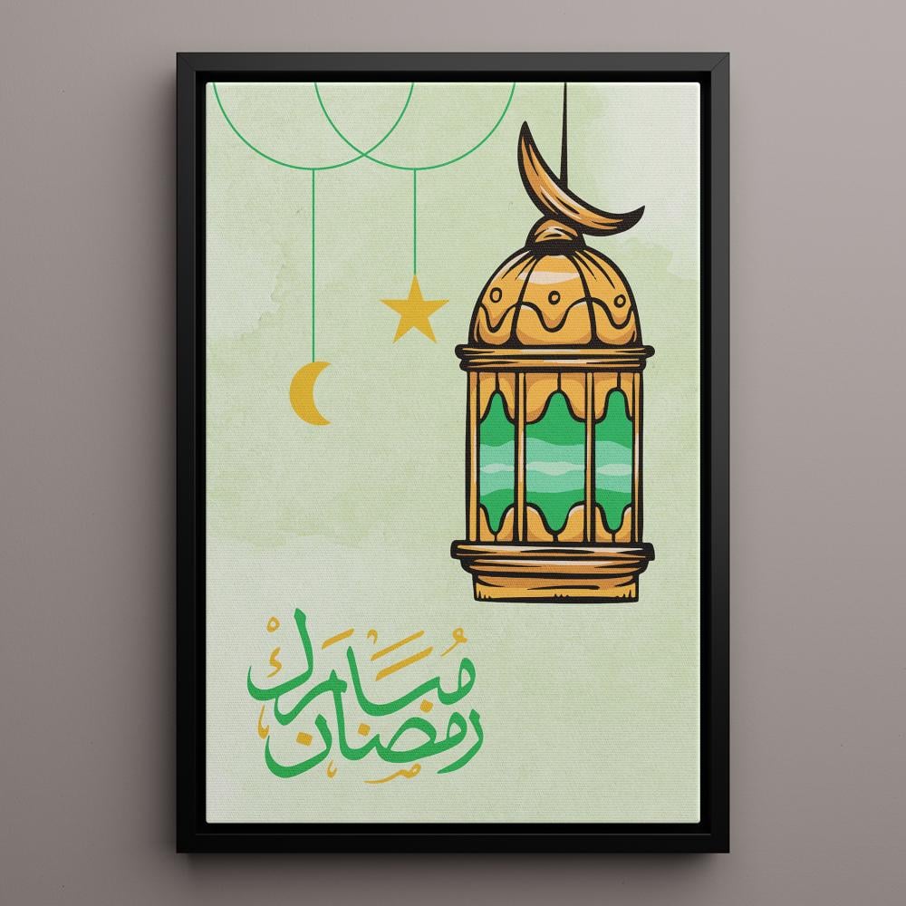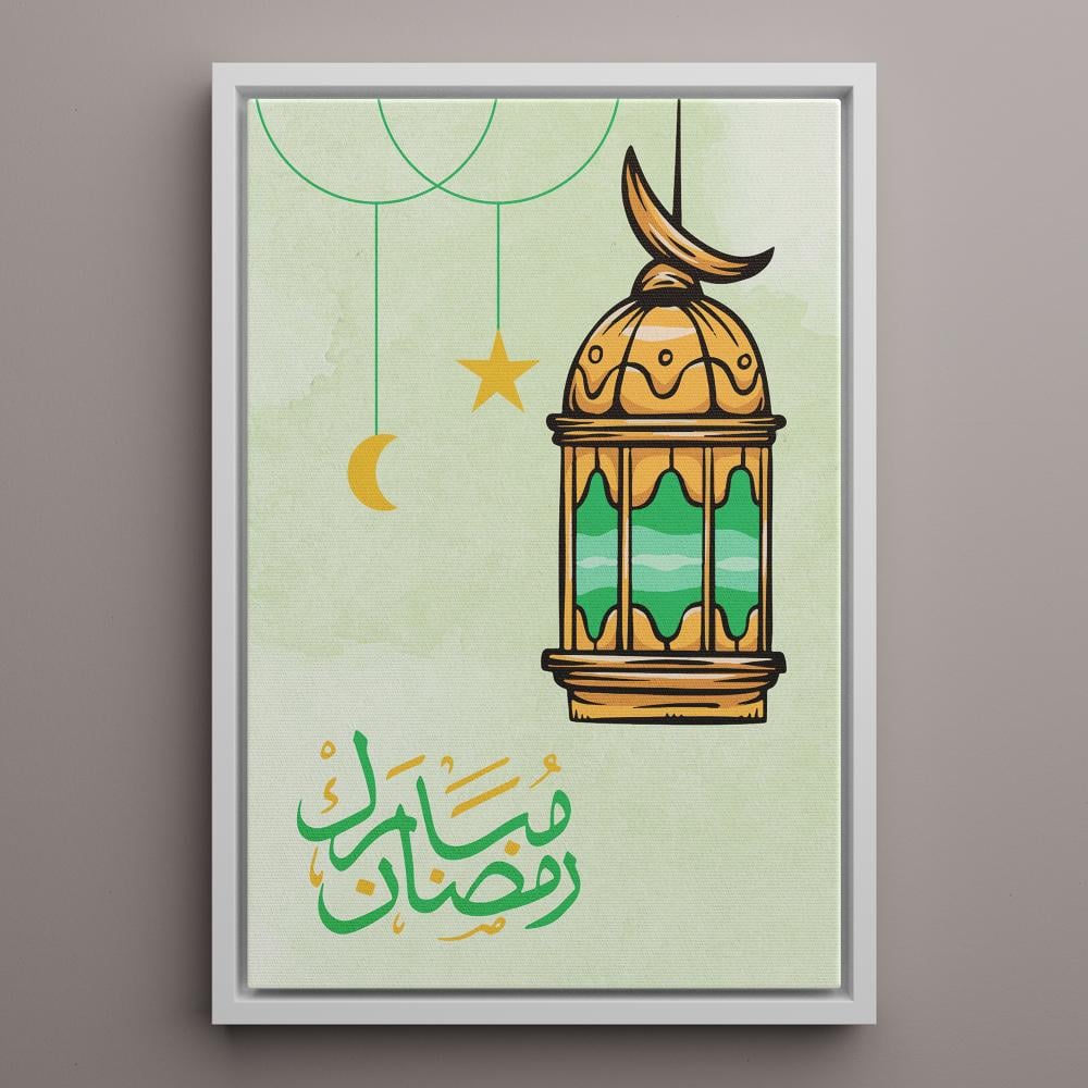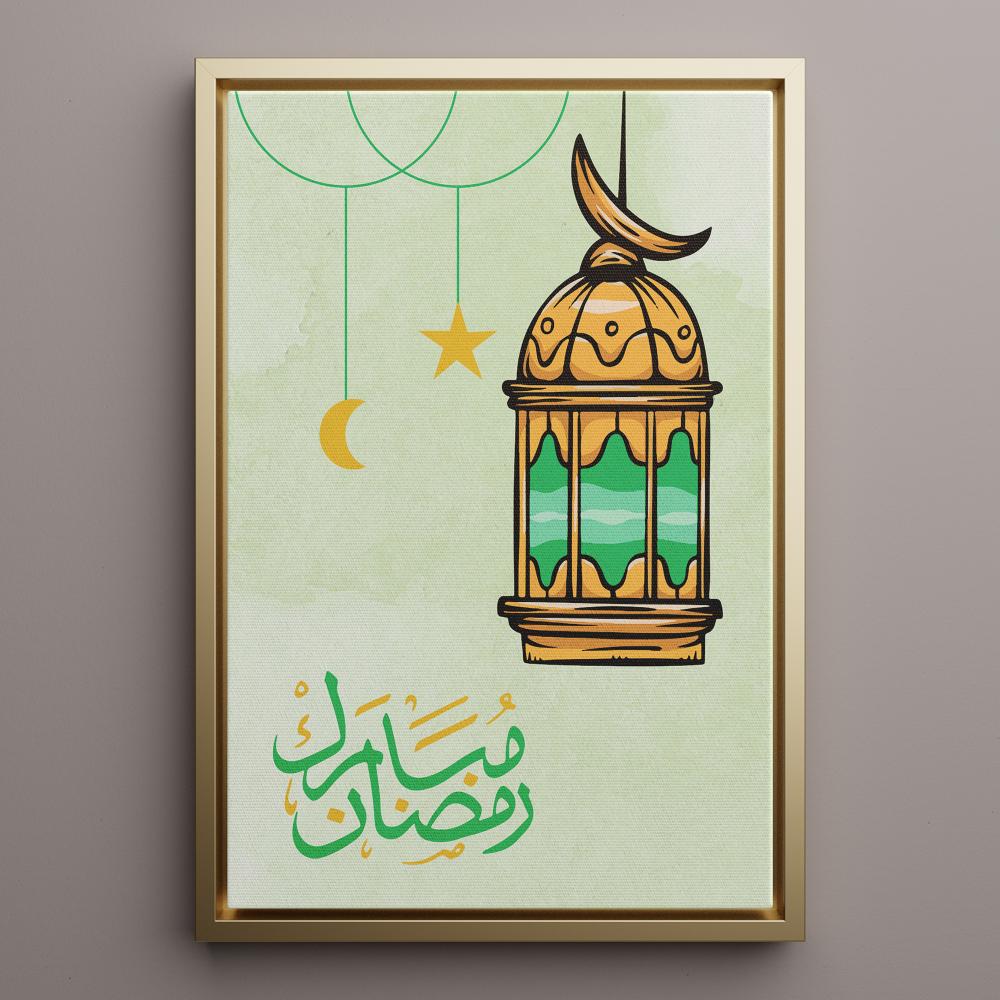 لوحه رمضان بتصميم رمضان مبارك مع فانوس رمضان، إنها خيار رائع للاحتفال بشهر رمضان المبارك حيث يوجد بها فانوس تقليدي جميل باللون الذهبي والأخضر ومكتوب عليها رمضان مبارك في بنفس الألوان مع خلفية هادئة تبرز جمال التفاصيل. ننصحك بالشراء الآن من متجر لوحة الذي يقدم مجموعة من أفضل اللوحات التي تناسب شهر رمضان المبارك.