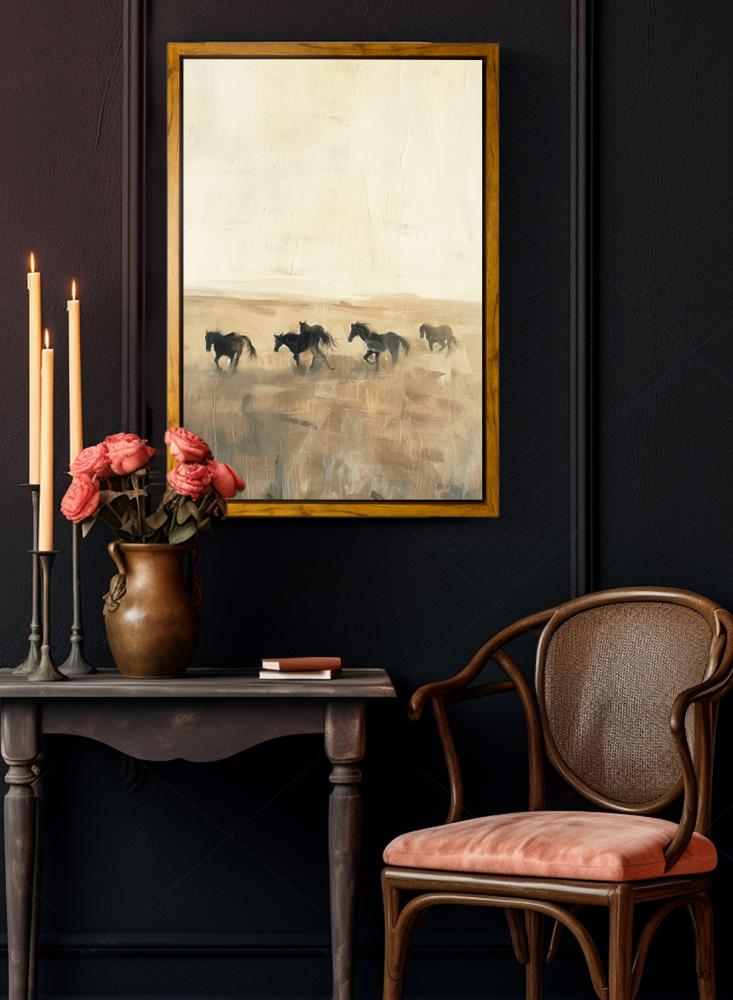 لوحة كانفاس على إطار خشبي بإطار خارجي باللون الخشبي وتصميم كلاسيكي لمجموعة من الخيول