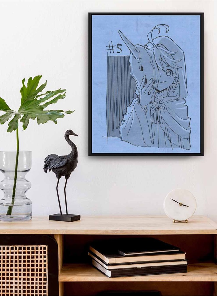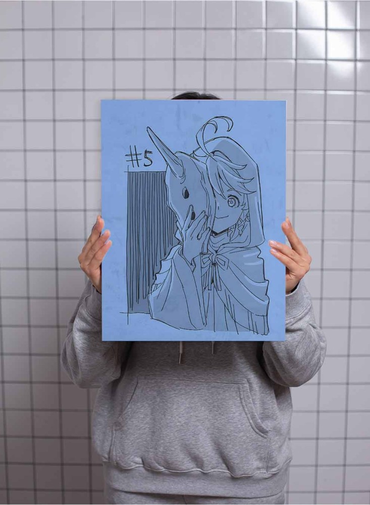 إذا كنت تبحث عن أفضل متجر لوحات انمي عليك بالشراء من متجر لوحة الذي يقدم تشكيلة واسعة من اللوحات الجميلة والتي تغير من ديكور المكان لديك. نرشح لك منها هذه اللوحة المميزة باللون الأبيض والأسود وهي مثالية لمحبي اللوحات من هذا النوع، إنها تظهر إيما أشهر شخصيات نيفرلاند الموعودة وهي تنزع قناع من على وجهها وتبتسم. إن إيما من الشخصيات اللطيفة والمحبوبة في هذا الإنما، لذلك من الرائع اقتناء رسمة لها، إذا كنت من محبي شخصيات الأنمي.
