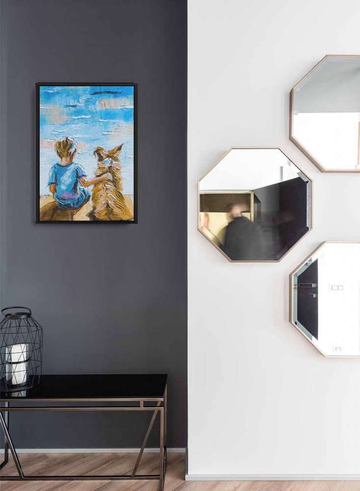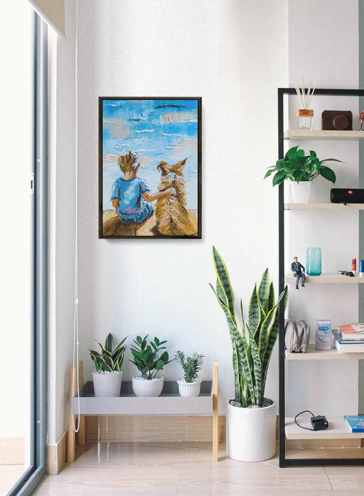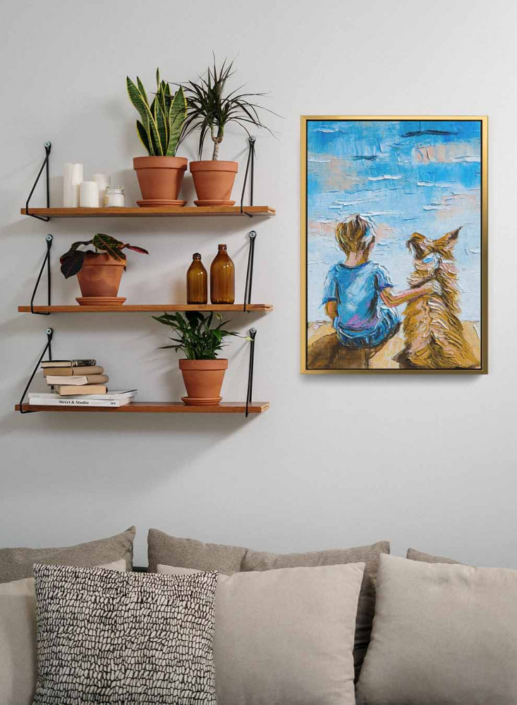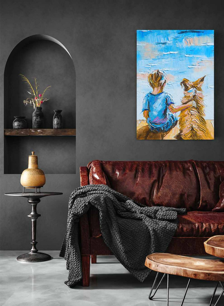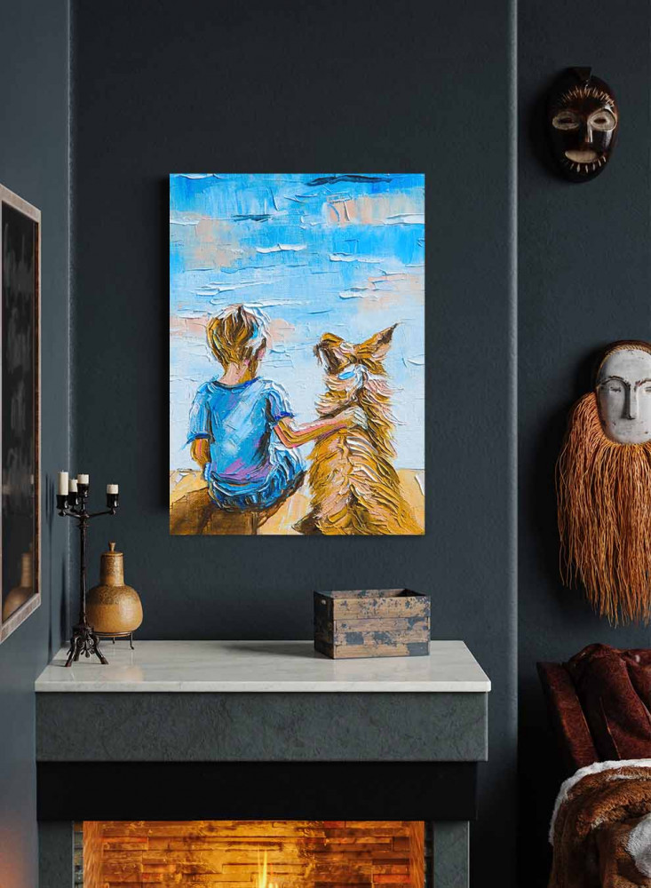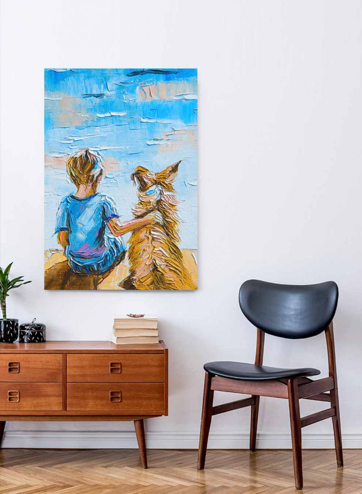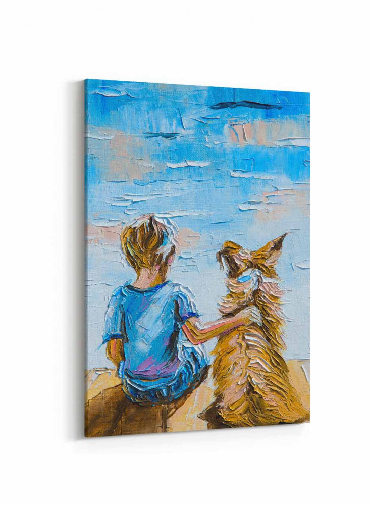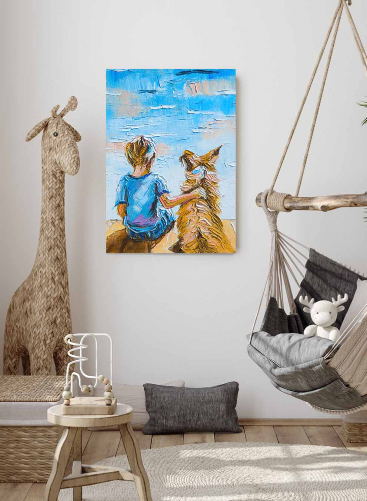 لوحة كانفاس على إطار خشبي، تصميم فن زيتي لطفل وكلب، للمنزل، غرفة المعيشة، المكتب، الديكور