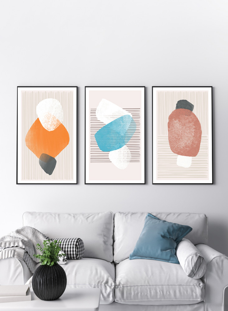 طقم من ٣ لوحات كانفاس على إطار خشبي، تصميم أشكال وخطوط تجريدية، للمنزل، غرفة المعيشة، المكتب، الديكور