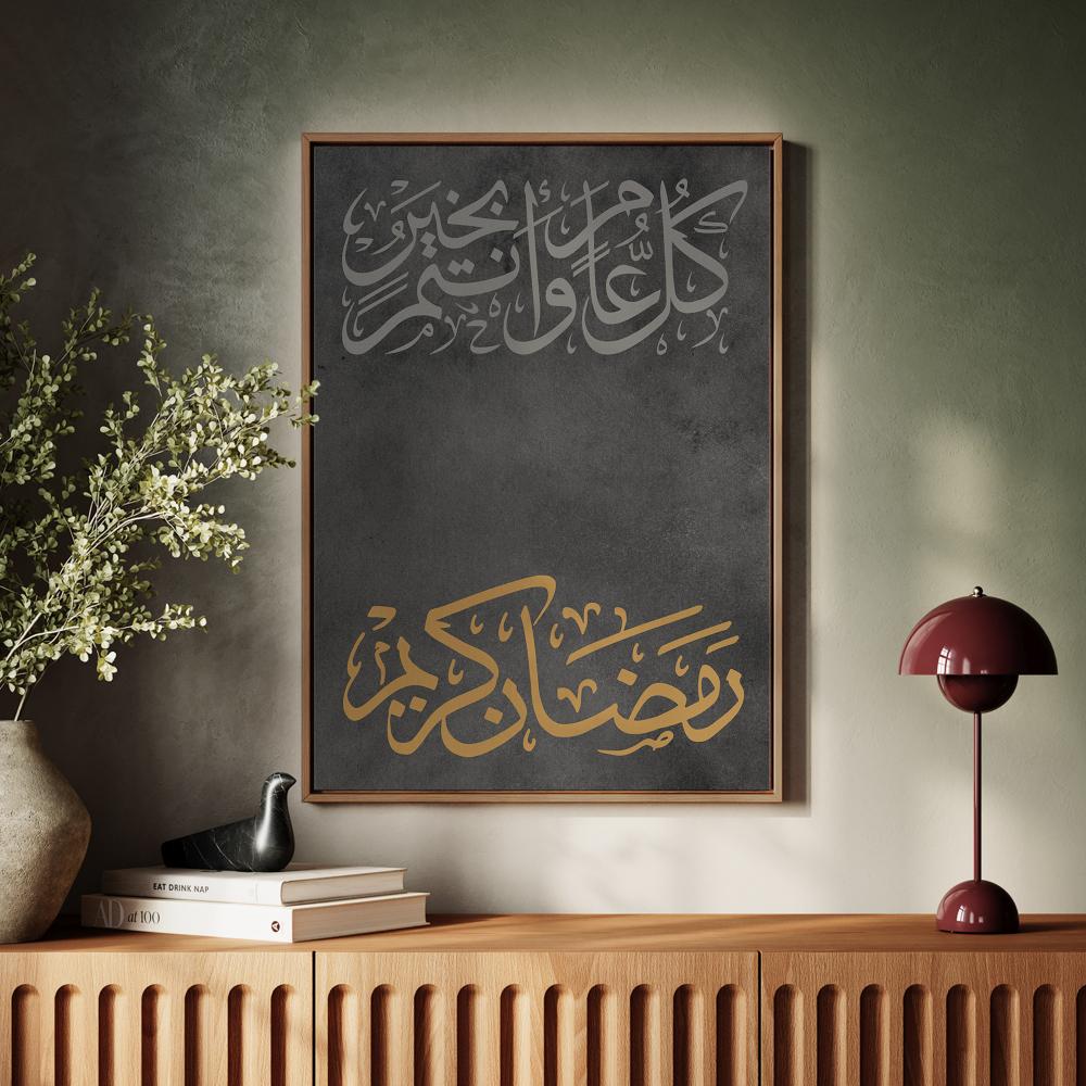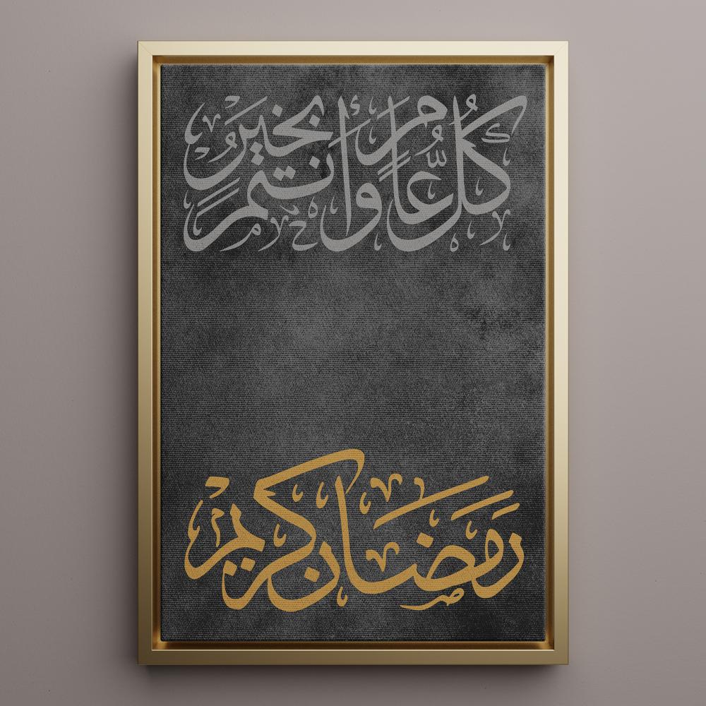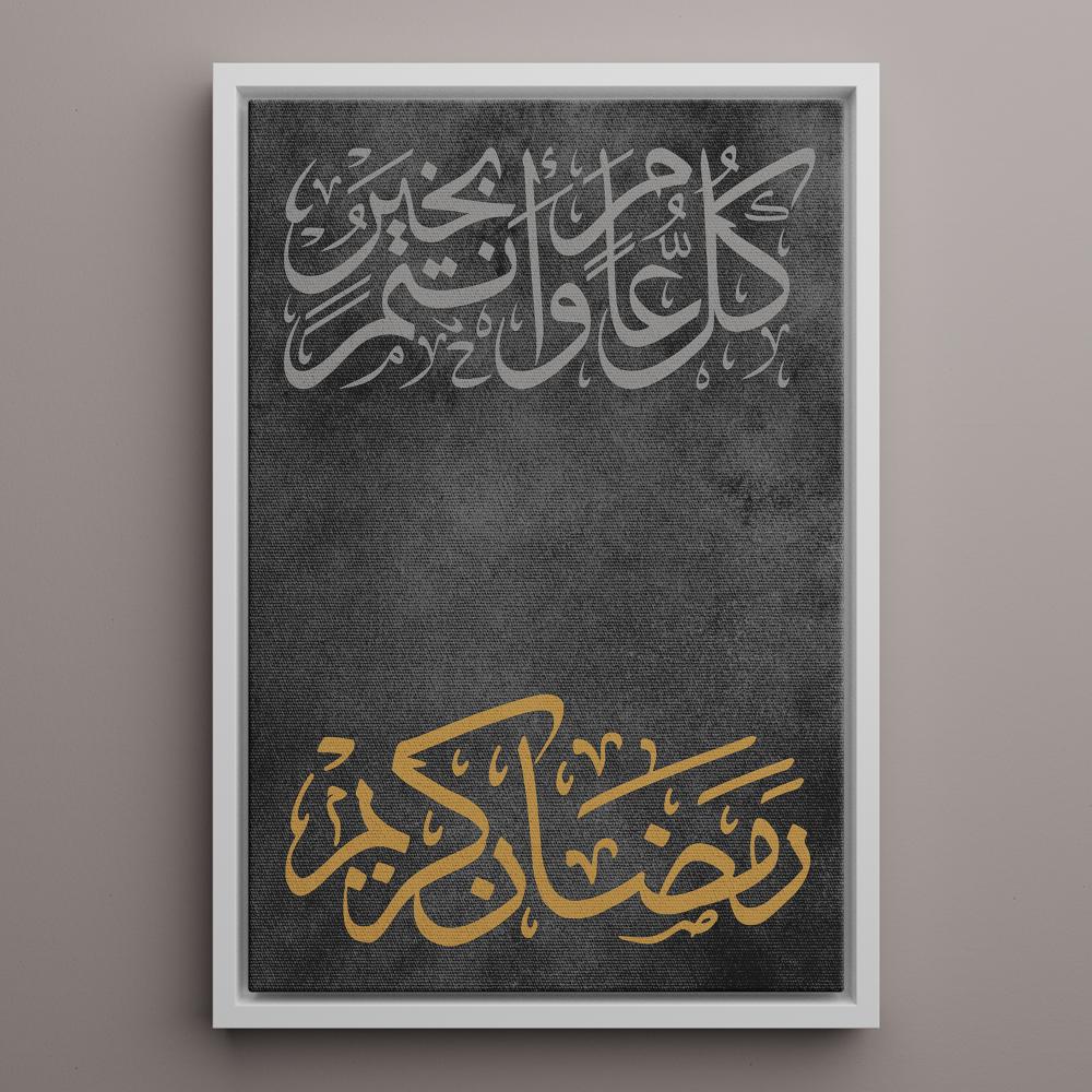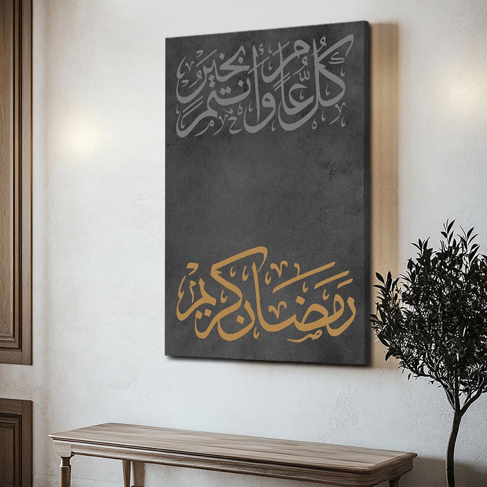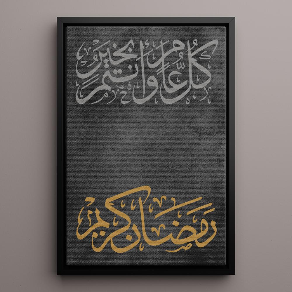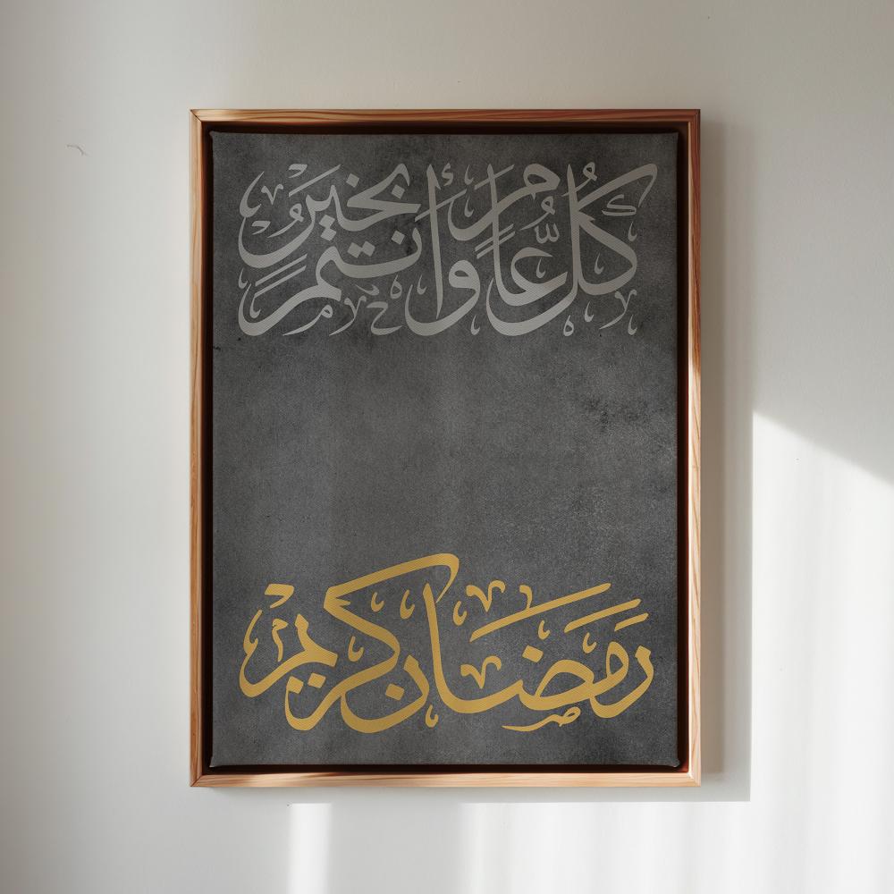- تأتي اللوحة بتصميم كل عام وأنتم بخير في أعلى اللوحة باللون الرمادي وتصميم رمضان كريم باللون الأصفر في أسفل اللوحة مما يخلق تنوع جميع في اللوحة.