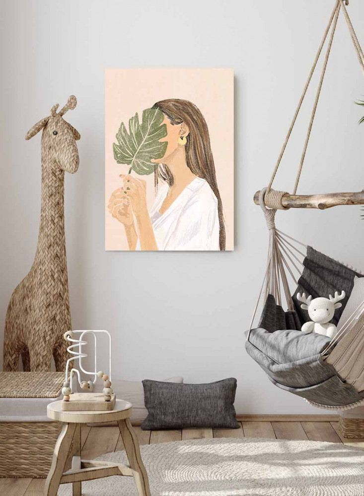لوحة كانفاس على إطار خشبي، تصميم فن تجريدي لامرأة مع ورقة نباتية ، للمنزل، غرفة المعيشة، المكتب، الديكور