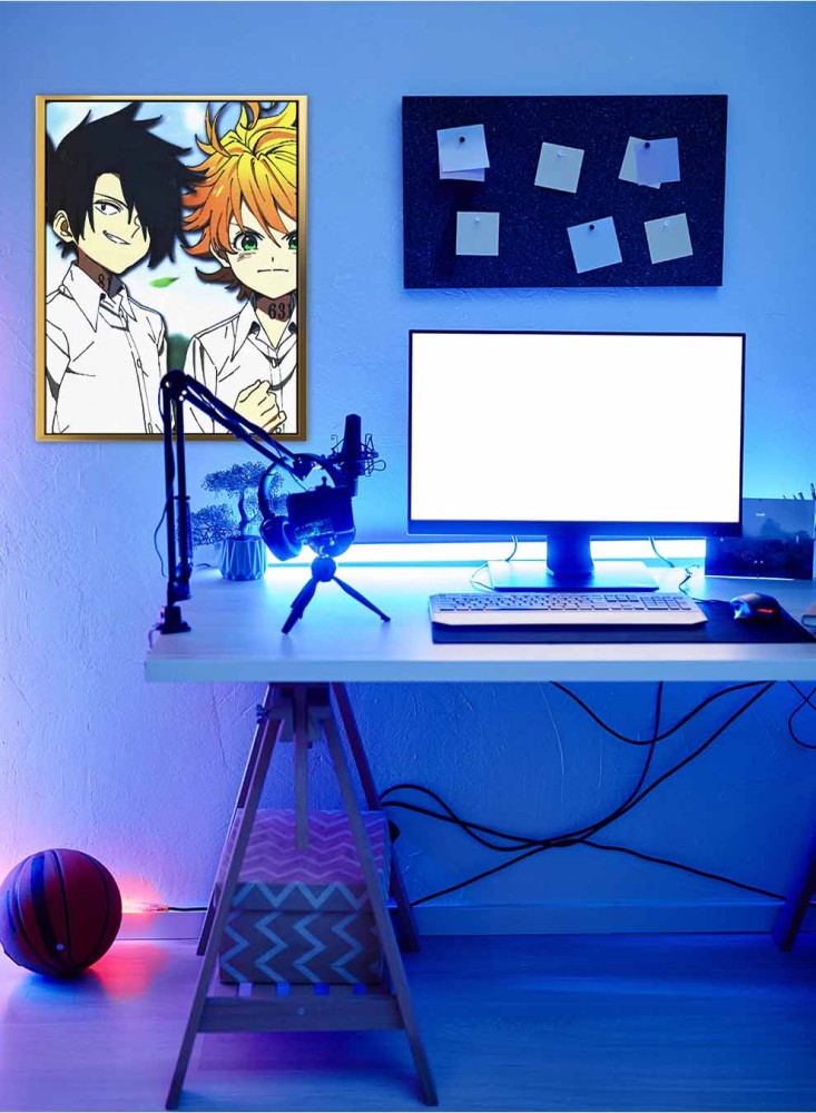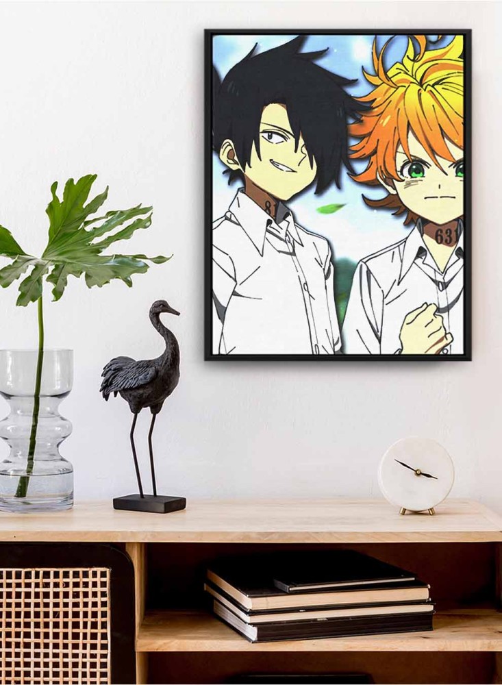 - تظهر اللوحة إيما وهي تنظر بتحدي وراي وهو يضحك وهما من أهم شخصيات هذه السلسلة اليابانية التي حققت نجاح كبير.