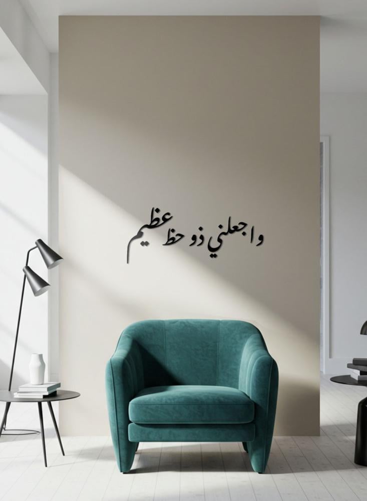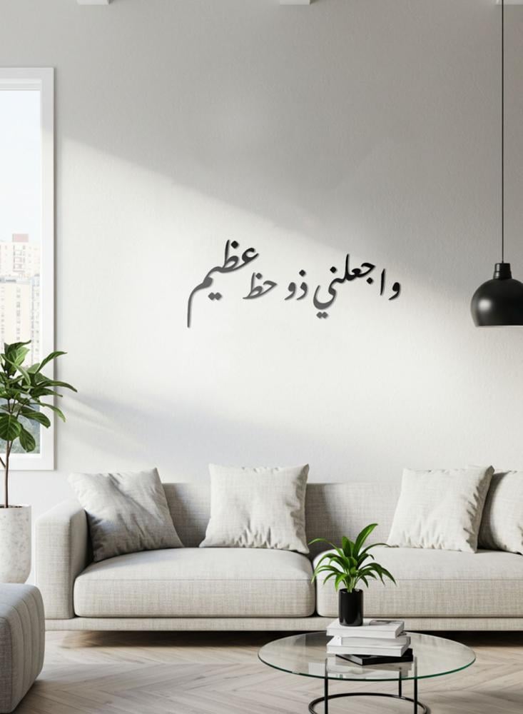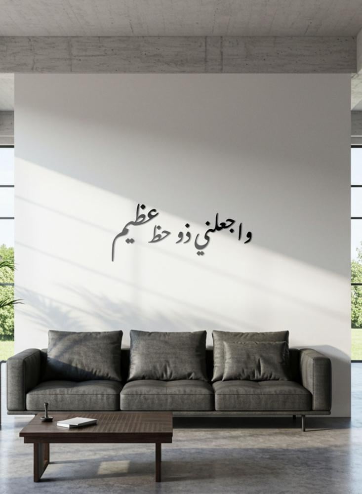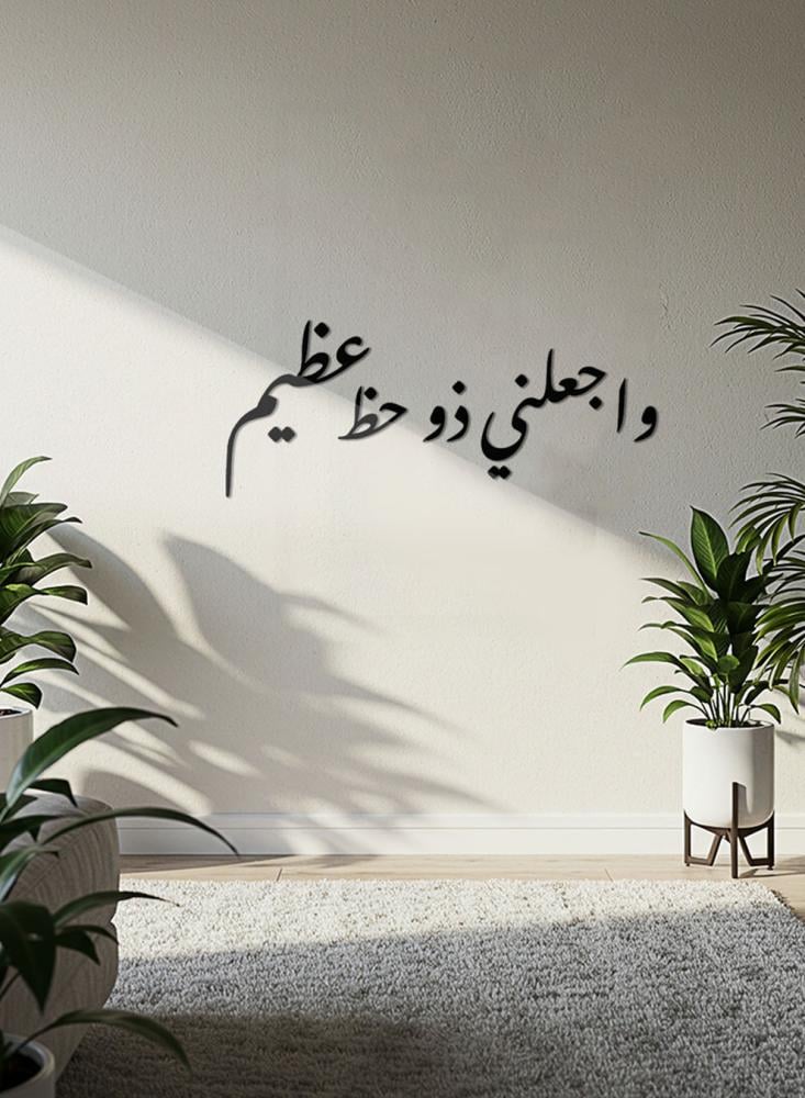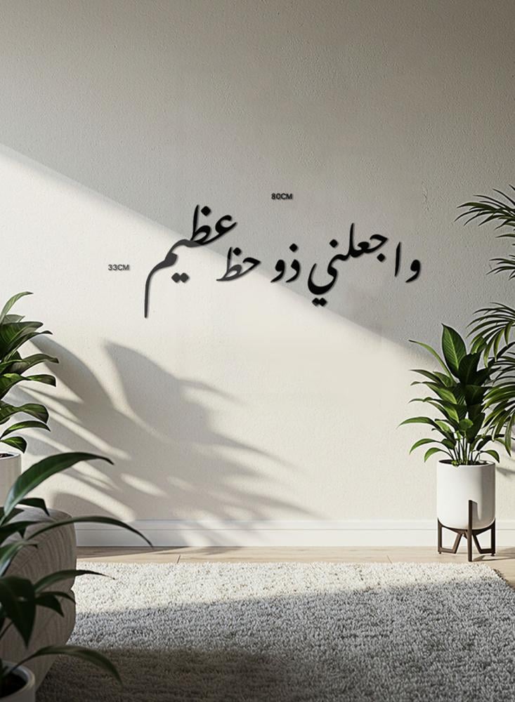أضف لمسة من الأناقة الروحية إلى منزلك مع هذه اللوحة الجدارية المصنوعة من الأكريليك والمصممة على شكل عبارة واجعلني ذو حظ عظيم بتقنية القطع بالليزر الدقيقة. تتميز بتصميم أنيق من الأكريليك الأسود بسماكة ٣ ملم بمظهراً راقياً يضفي على المكان طابعاً فريداً. مزوّدة بلاصق خلفي قوي لتثبيت سهل وآمن على الجدار دون الحاجة إلى أدوات أو حفر. تأتي هذه اللوحة بمقاس ٨٠ × ٣٣ سم. صنعت بفخر في المملكة العربية السعودية.