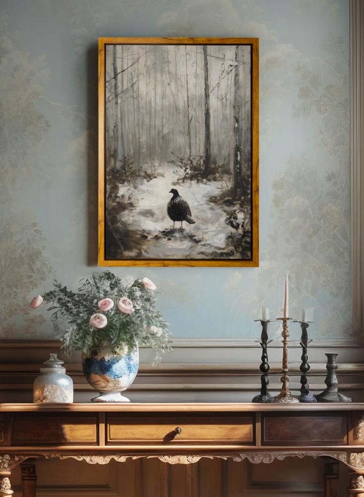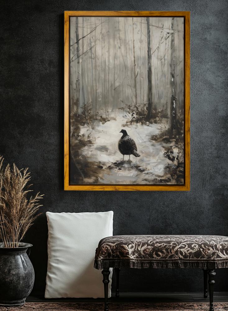 لوحة كانفاس على إطار خشبي بإطار خارجي باللون الخشبي وتصميم كلاسيكي لطائر وسط الغابة