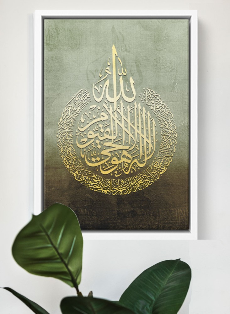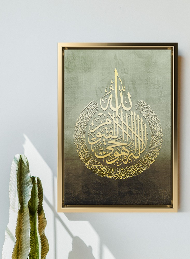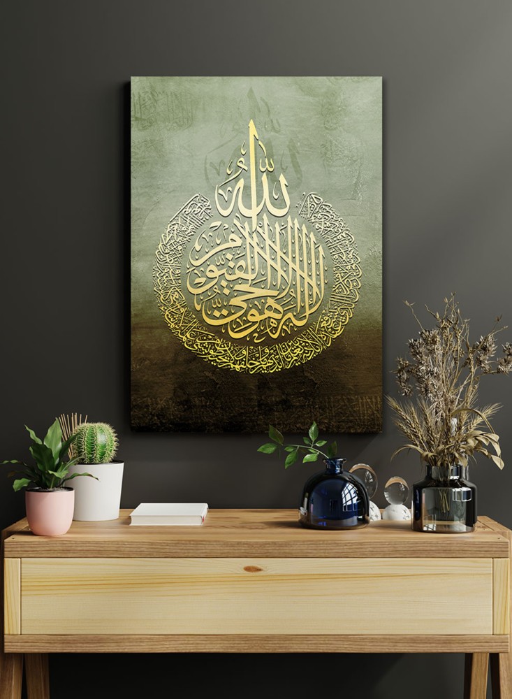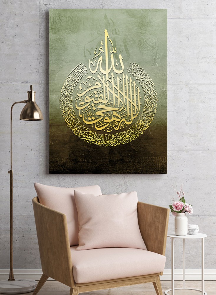 - آية الكرسي مطبوعة في منتصف اللوحة باللون الأصفر الجميل ومكتوبة بالخط العربي والزخارف الإسلامية الرائعة.