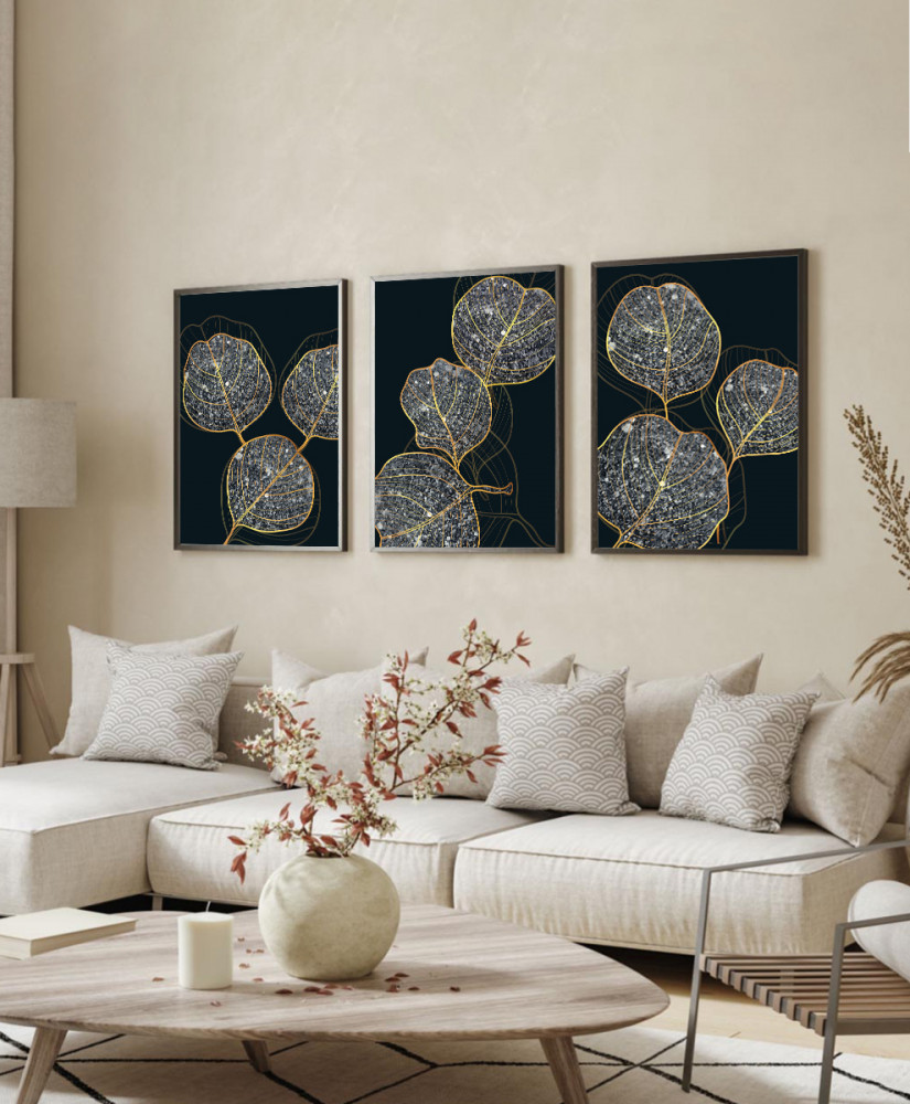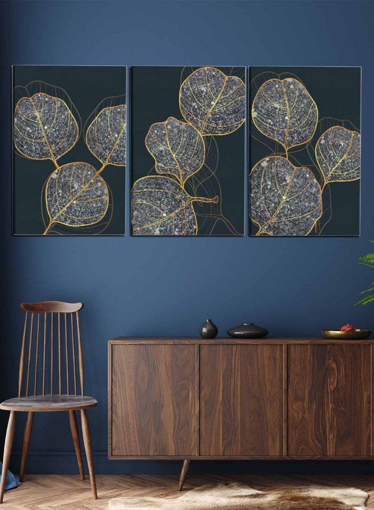 طقم من ٣ لوحات كانفاس على إطار خشبي، تصميم أوراق نباتية لامعة، للمنزل، غرفة المعيشة، المكتب، الديكور