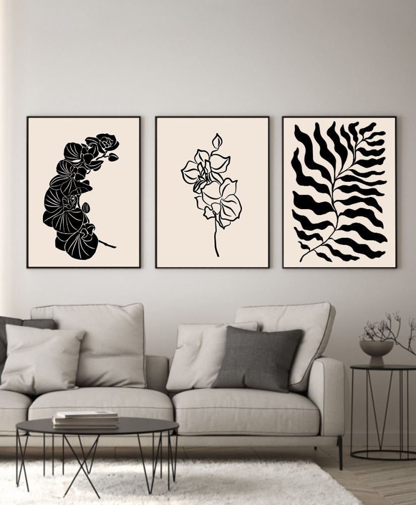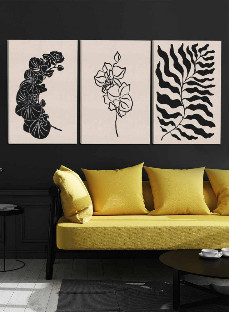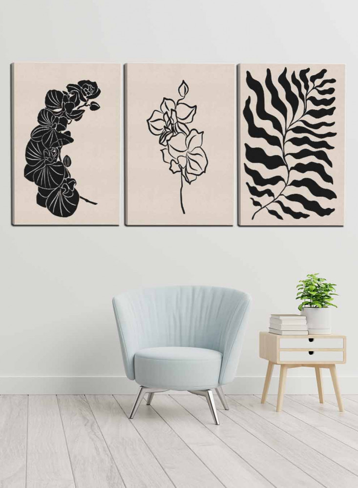 Set of 3 Canvas Paintings on Wooden Frame, Dark Botanical Leaves Design, for Home, Living Room, Office, Decoration