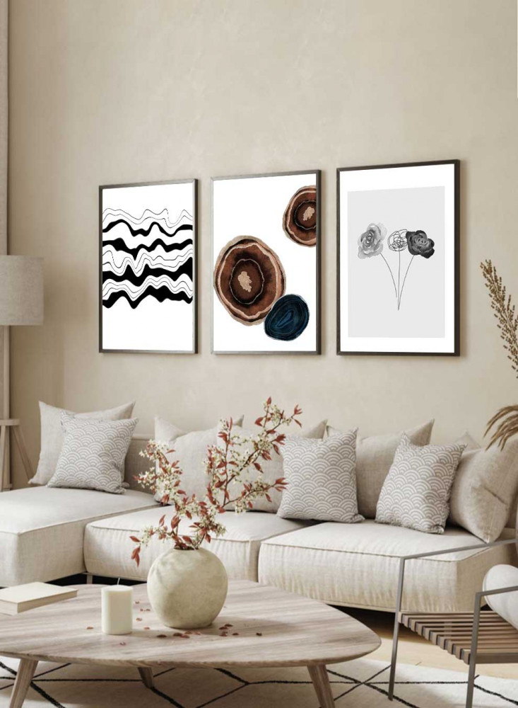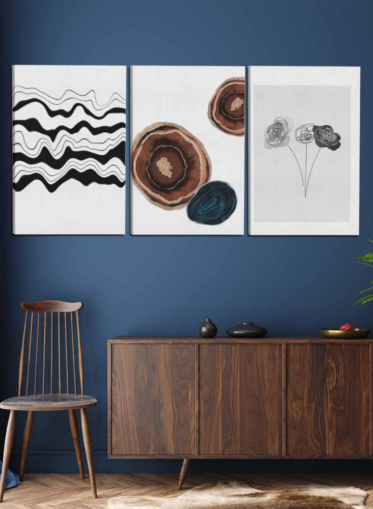 طقم من ٣ لوحات كانفاس على إطار خشبي، تصميم ورود وخطوط مموجة، للمنزل، غرفة المعيشة، المكتب، الديكور